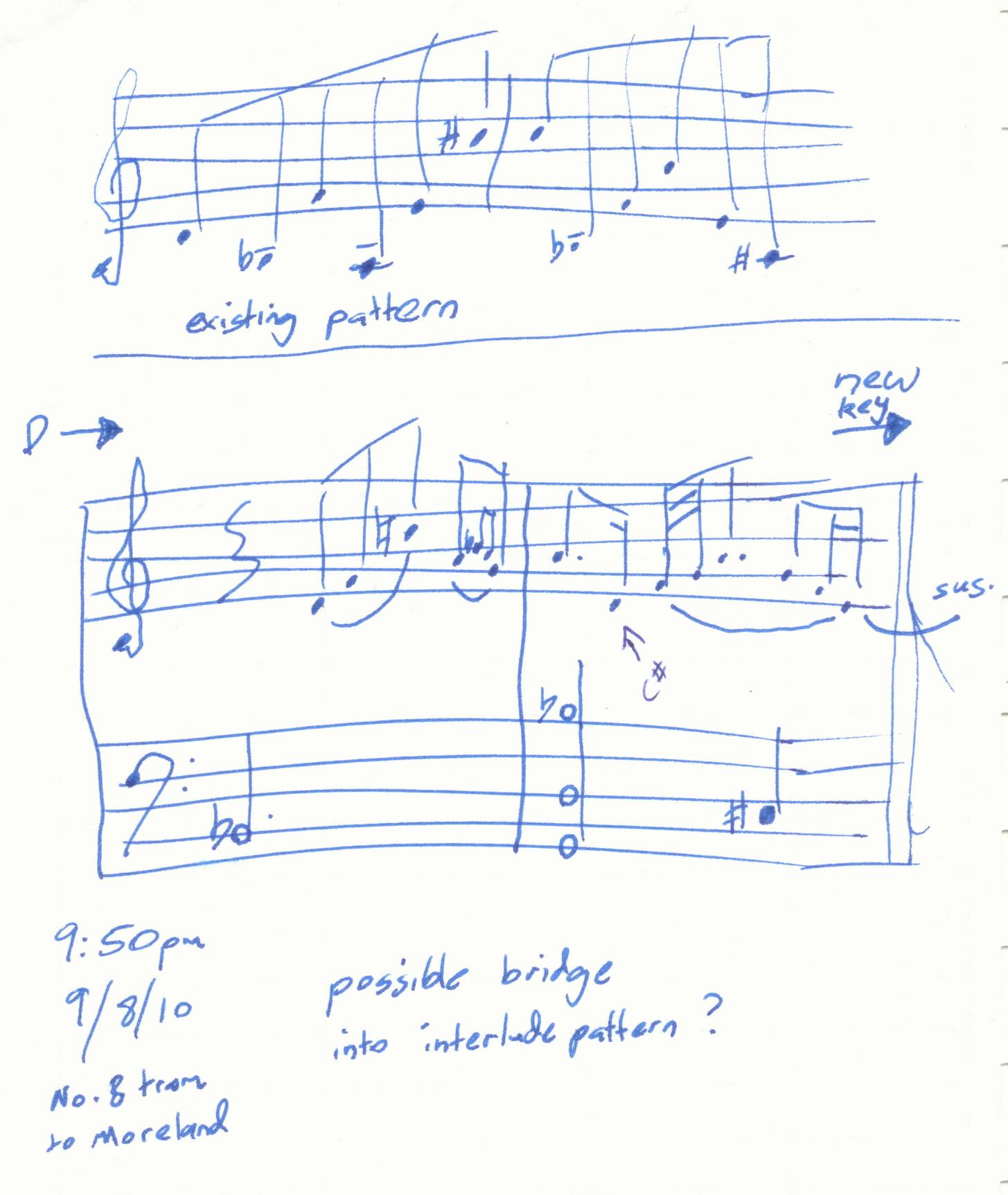 On reflection, the bridge sections felt like they needed a more overtly contrasting gesture and this came a little later one night on the tram home from the city. I didn’t have any manuscript paper on me so I roughly drew it up on the back page of an address book: