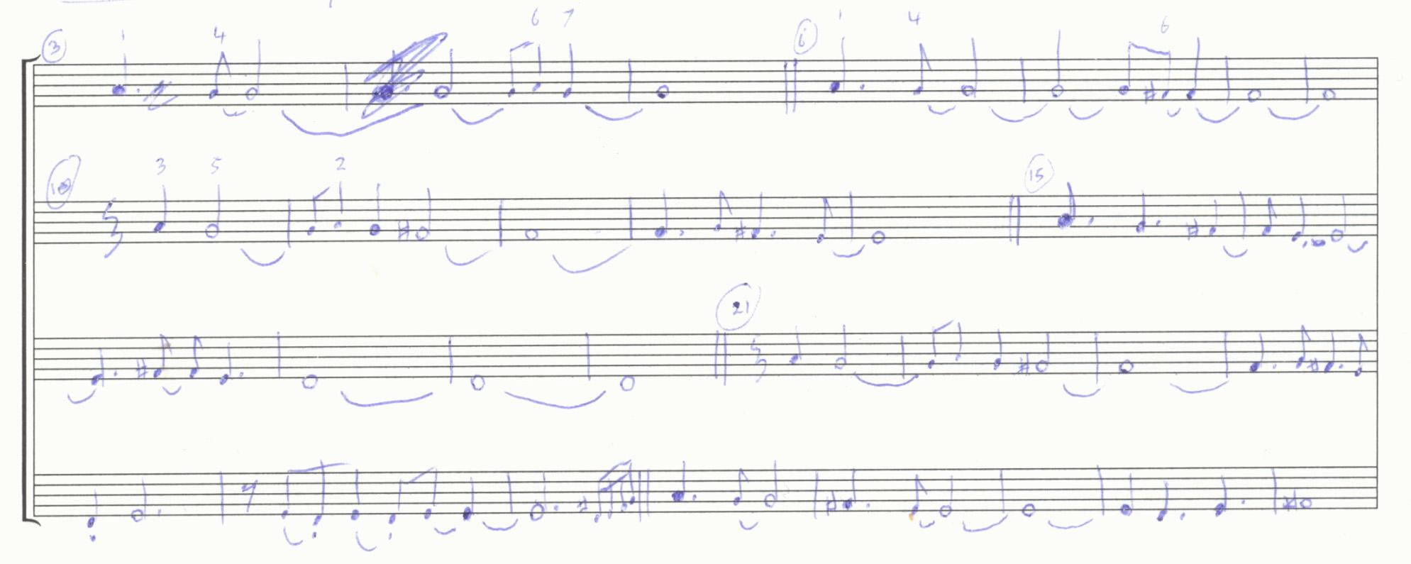 While this is strictly ordered, the smaller note–to–note detail is relatively free and through-composed to the halfway point. Additionally, oscillation between adjacent chords is freely allowed and was worked out by sketching the top note of the chord in a manner that would provide phrase variation (shown in part by numbers referring to what quaver beat the new notes fall on: 1, 4, 6, 7, 1, 4, 6, 3, 5, 2 etc.):