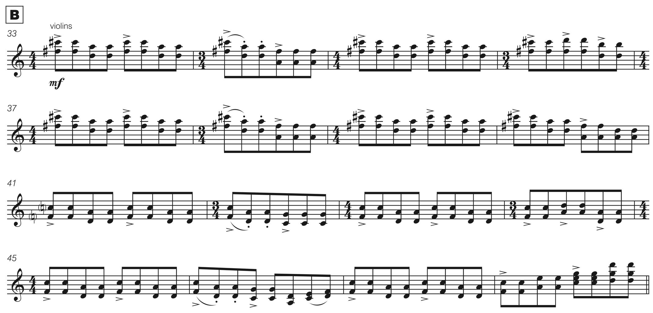 Noting that ‘2+2’ represents a 4/4 bar and that ‘3’ represents a 3/4 bar, the above pattern is therefore a 16–bar cycle. And before that cycle appears as a fully scored and harmonised ostinato at bar 33, there are two 16–bar sections. The first (bars 1–16) is an orchestral fanfare to represent the ‘grand ceremonial welcome’. This presents motivic fragments of what is to come with the full orchestra tutti in a glittering, swirling, call and answer texture, that establishes a fast tempo of crotchet = 168. The second (letter A, bars 17–32) immediately drops back to a soft dynamic. It introduces one part of the quaver ostinato against falling harmonic tones. This sets up the arrival proper of the fully formed ostinato texture at letter B, that is foregrounded in the violins:
