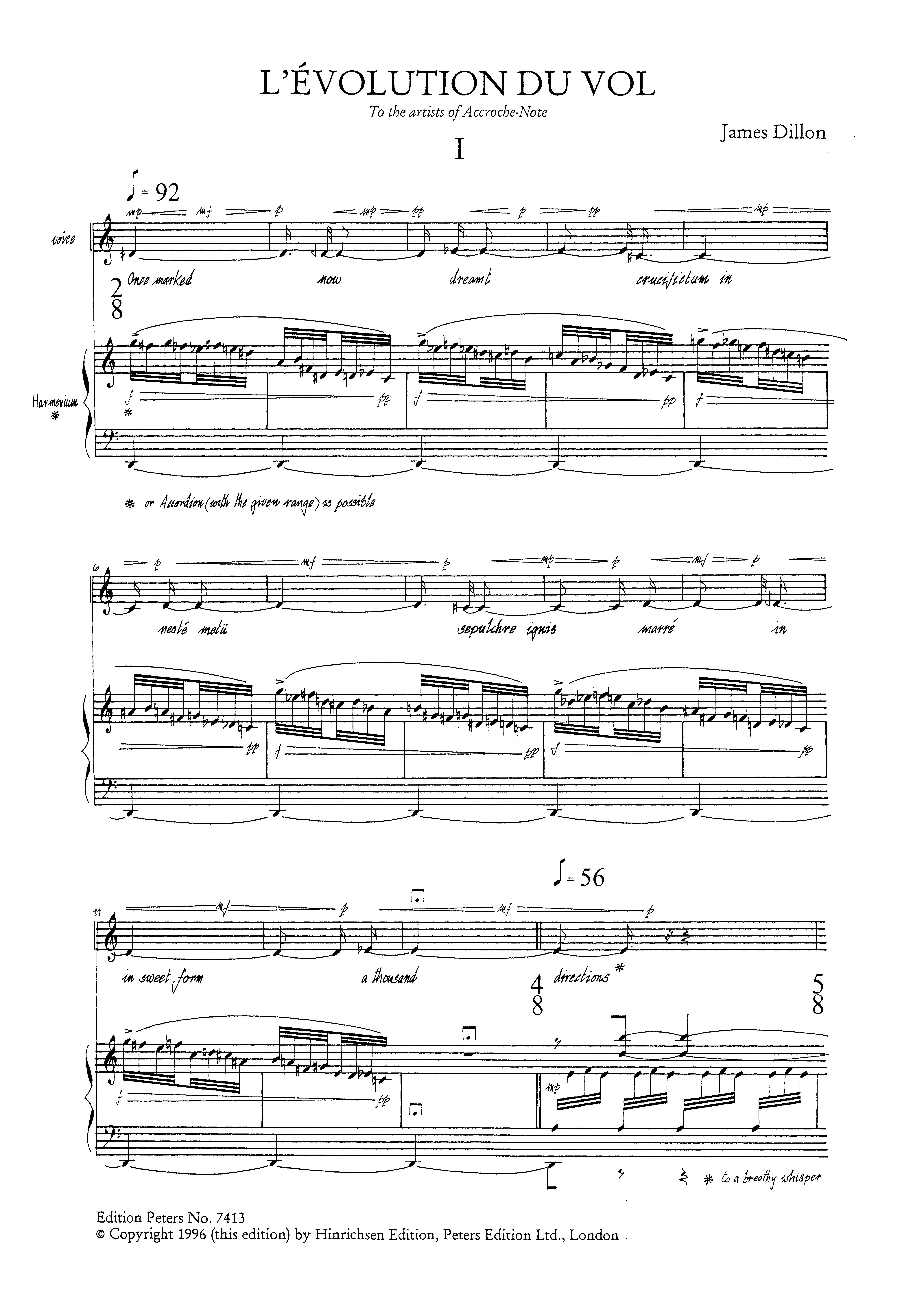 James Dillon (*1950) wird seit 1982 von der Edition Peters verlegt. Im gleichen Jahr wurde Parjanya-Vata für Violoncello solo bei den Darmstädter Ferienkursen für Neue Musik mit dem Kranichsteiner Musikpreis ausgezeichnet. Das Arditti- Quartett brachte im Folgejahr Dillons Streichquartett Nr. 1 beim Huddersfield-Festival für Zeitgenössische Musik zur Uraufführung – nur eines von vielen Festivals, bei denen seine Musik regelmäßig erklingt. Zu weiteren Werken gehören das „German Triptych“ (Überschreiten, 1985; helle Nacht, 1987; Blitzschlag, 1996) sowie die Oper Philomela (2004). Im Jahr 2003 erhielt er die Ehrendoktorwürde der Universität Huddersfield, und 2007 übernahm er eine Professur für Komposition an der University of Minnesota.