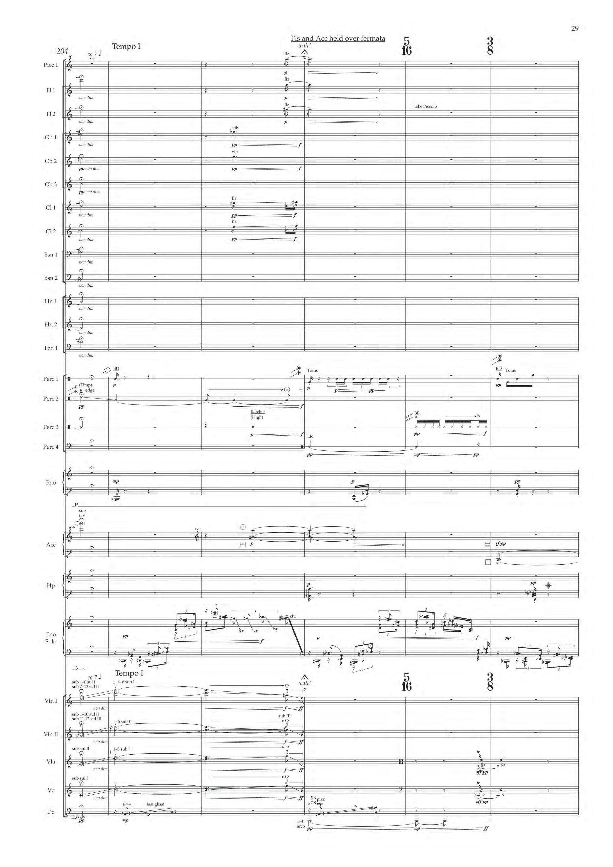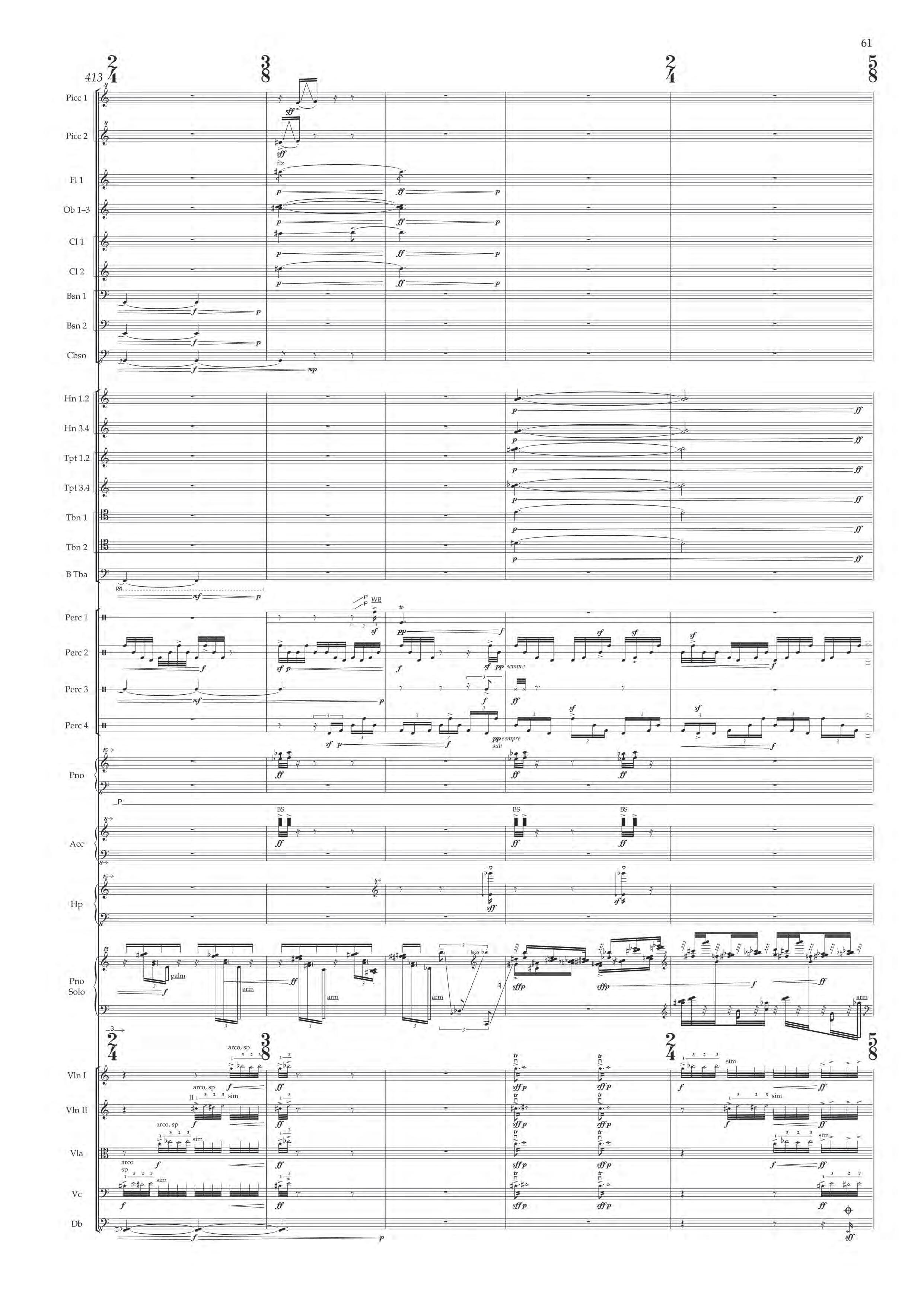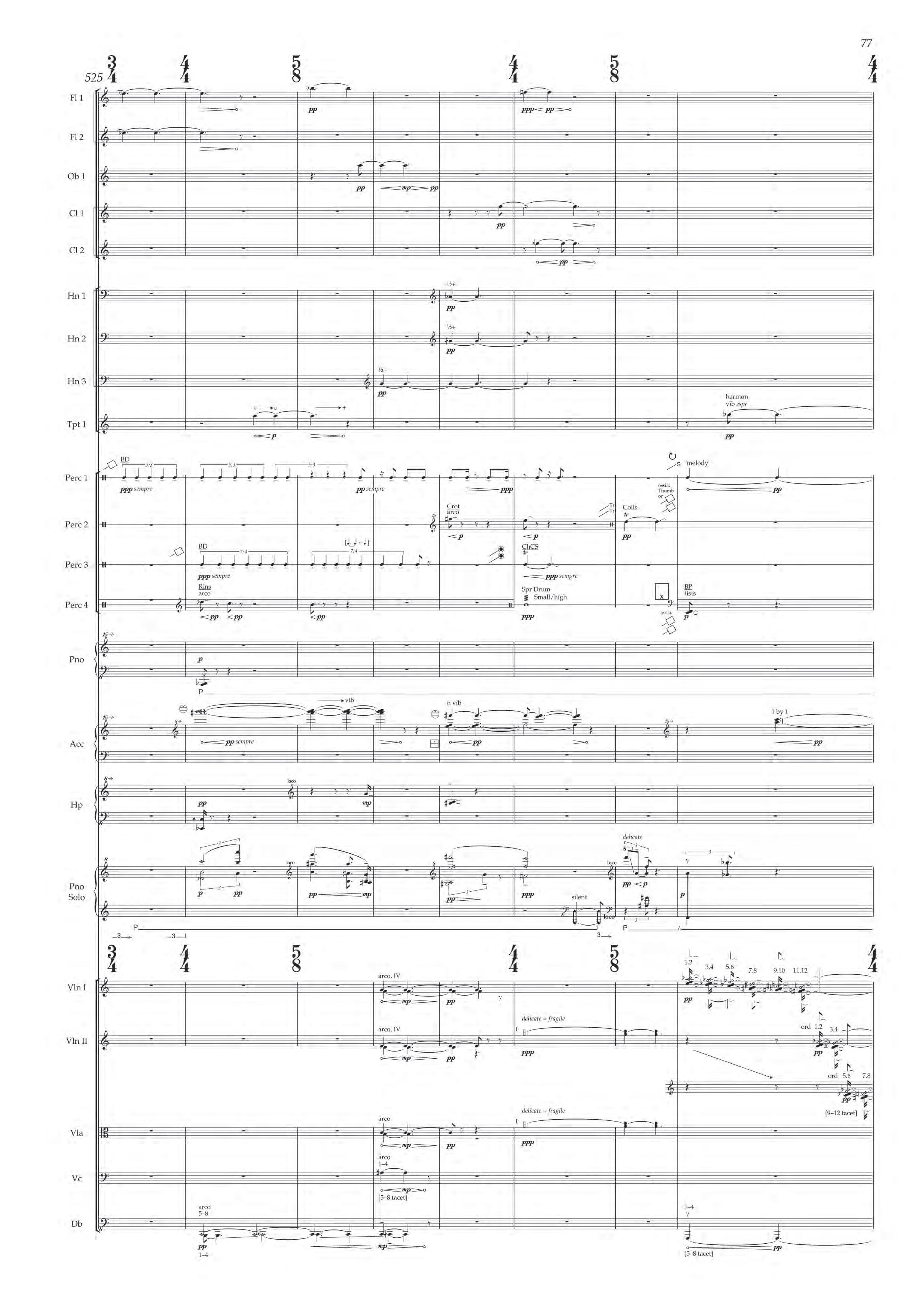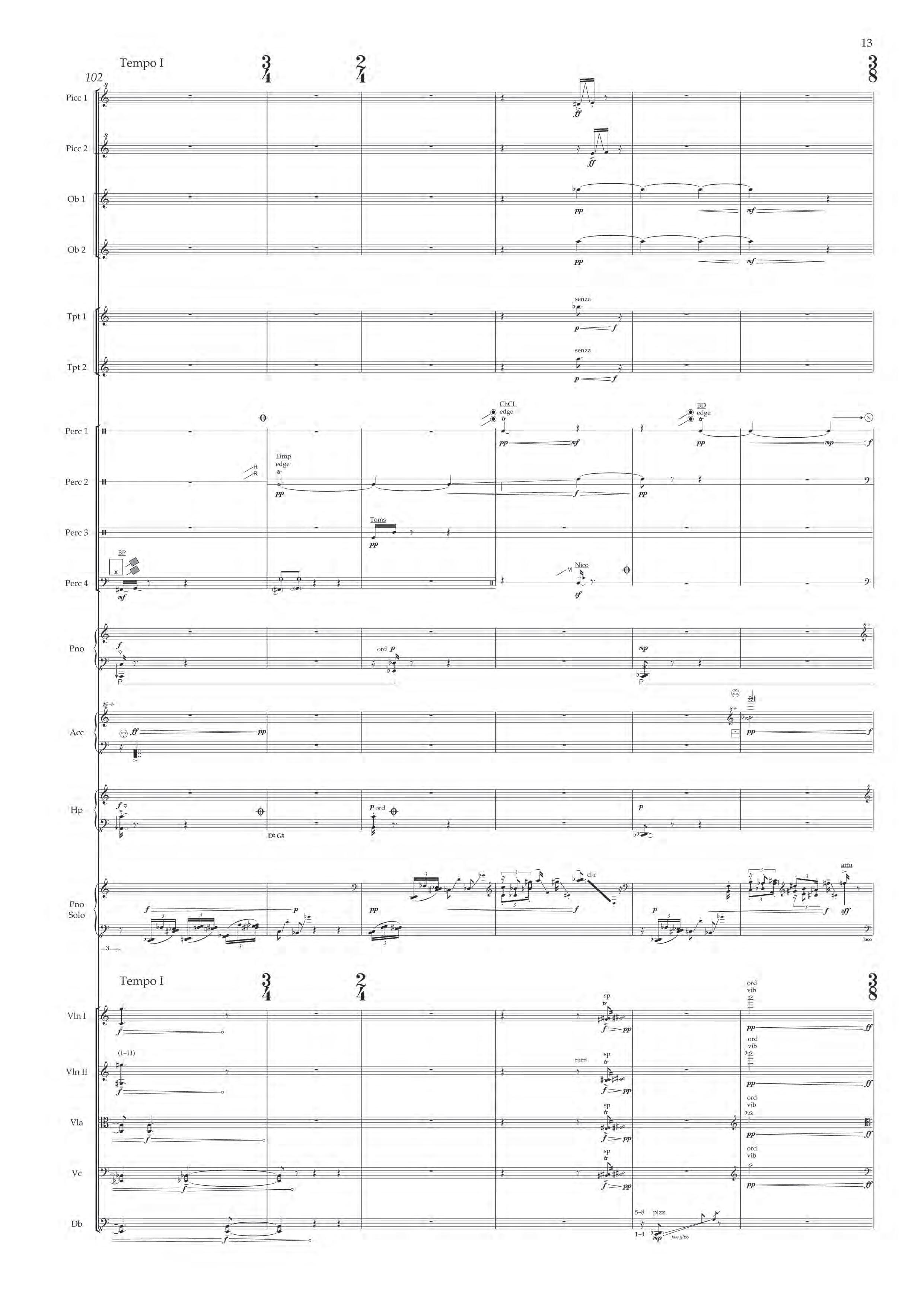 The fast sections are like a dancing fury – bring out extreme dynamic and timbral contrast at all times, and please note sudden contrast between Tempo I and more delicate Tempo II; the slower passages are always spacious, static and expressive – allow the solo piano resonances and expansive orchestra gestures to take shape before moving on.
