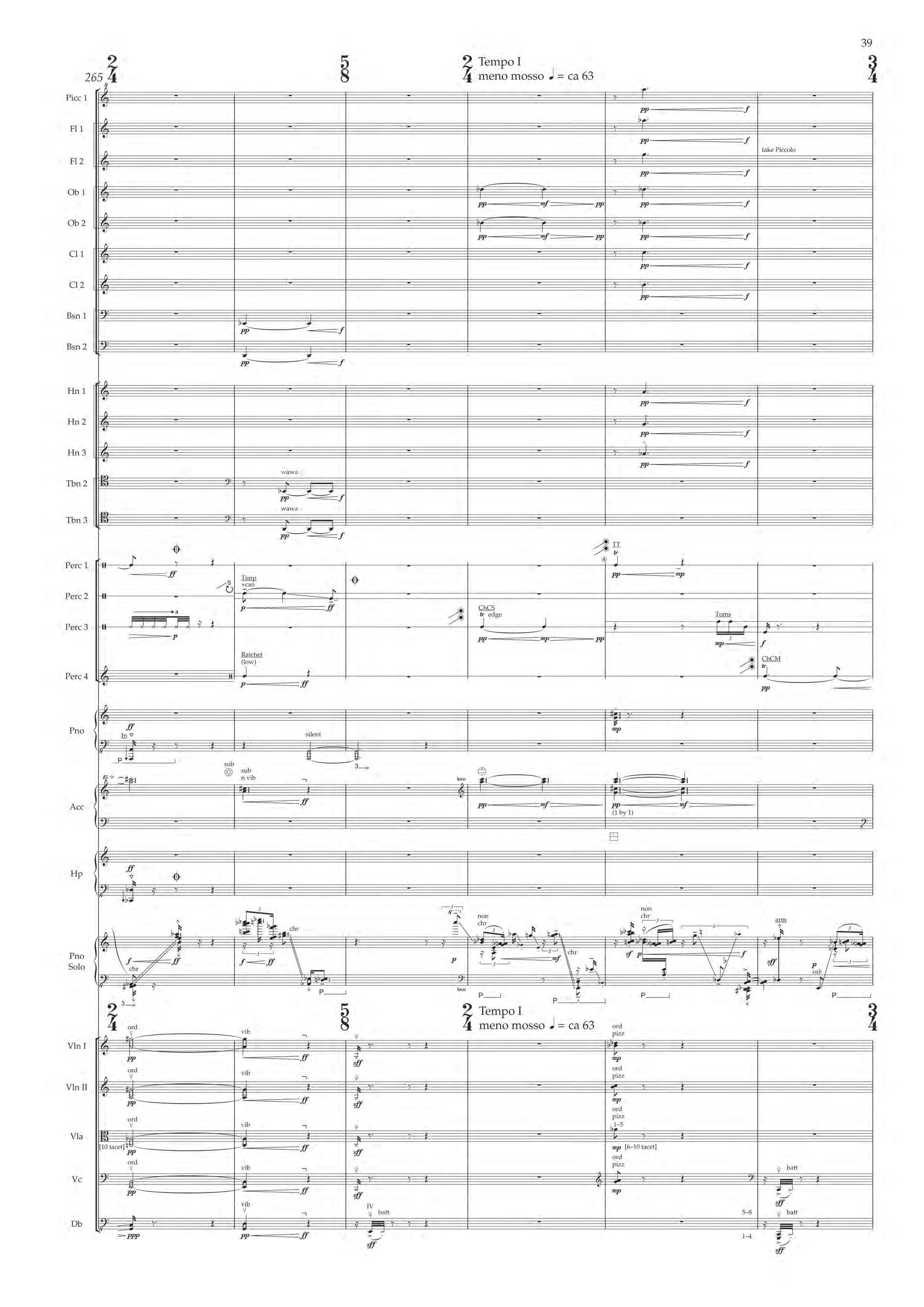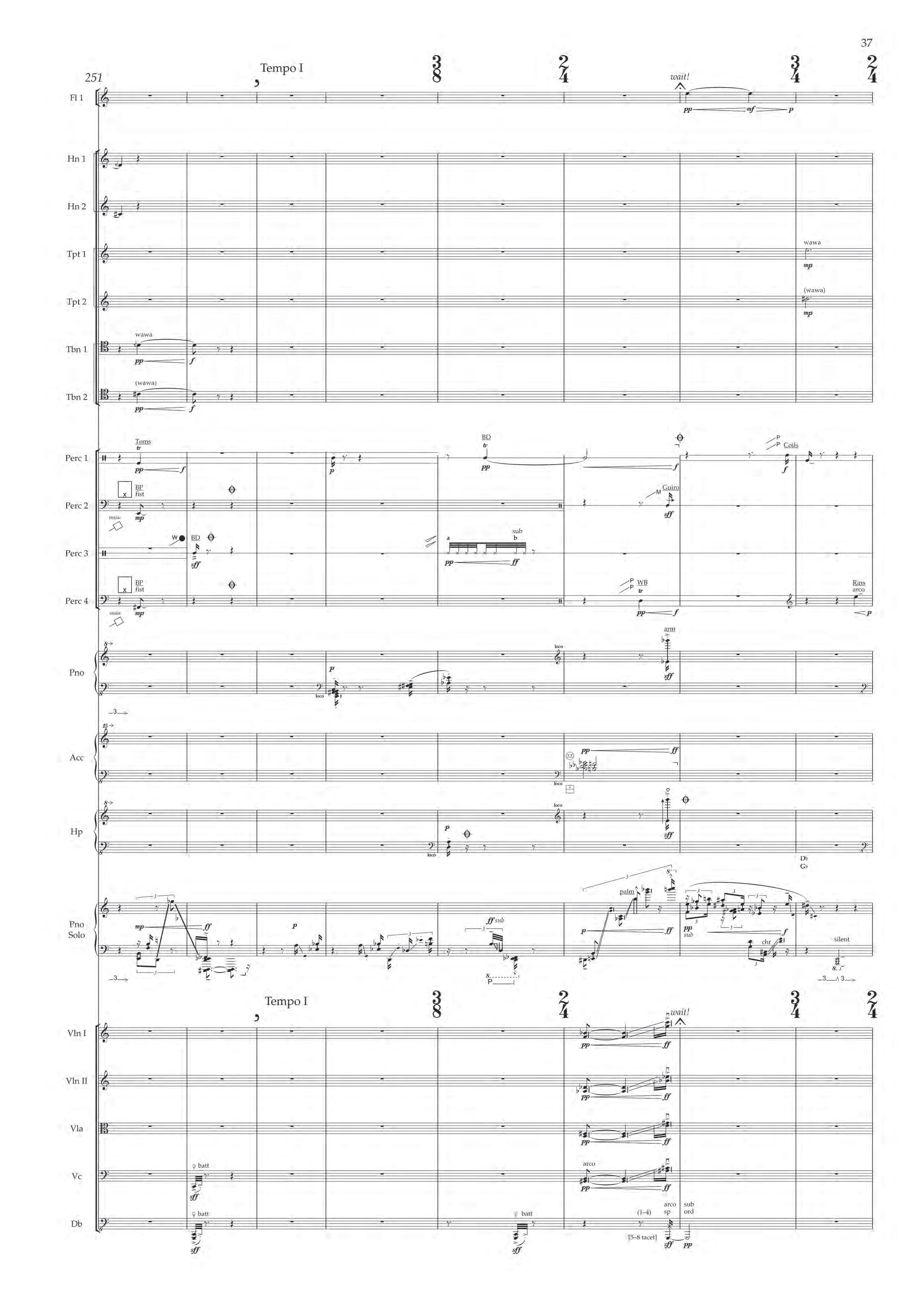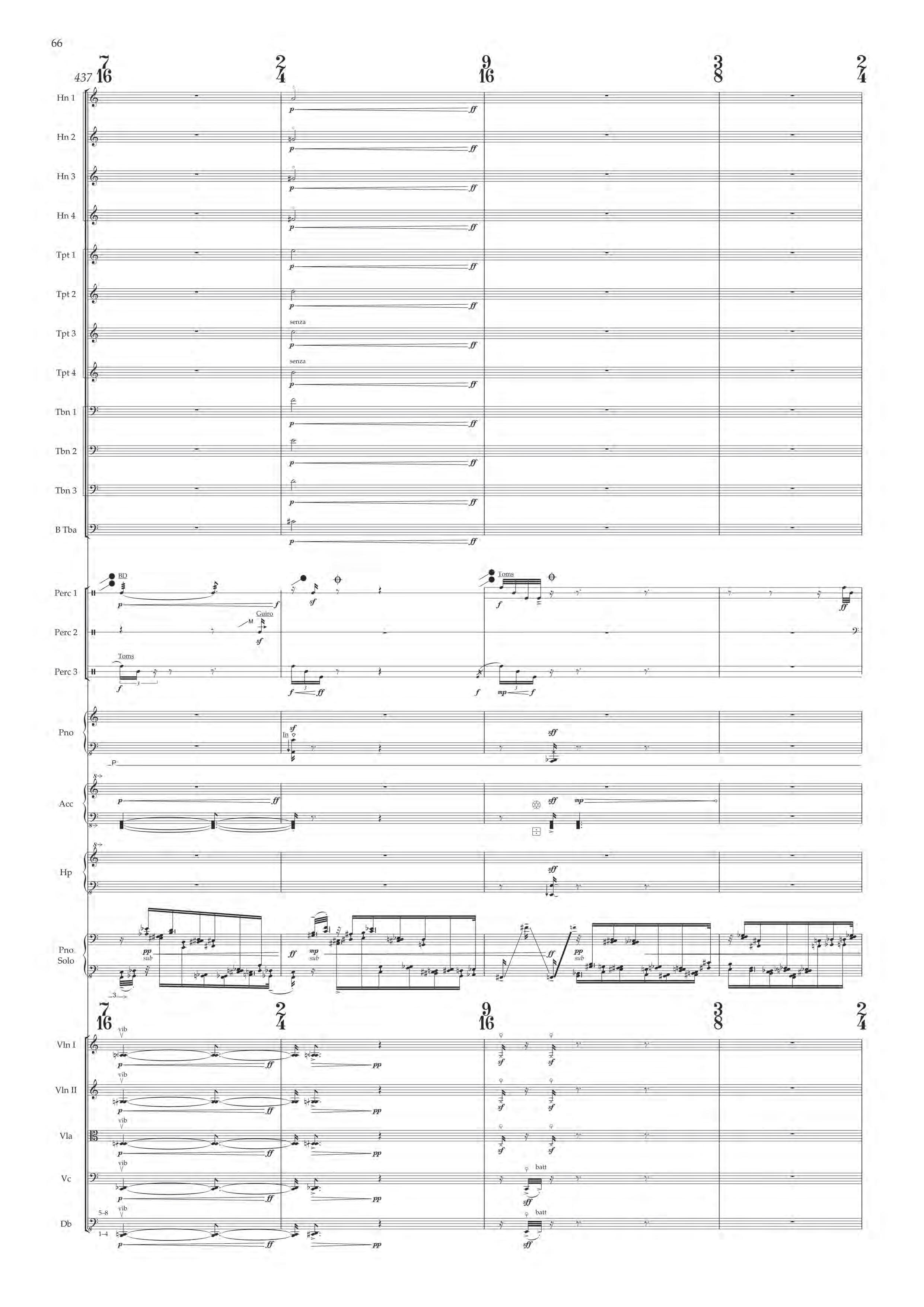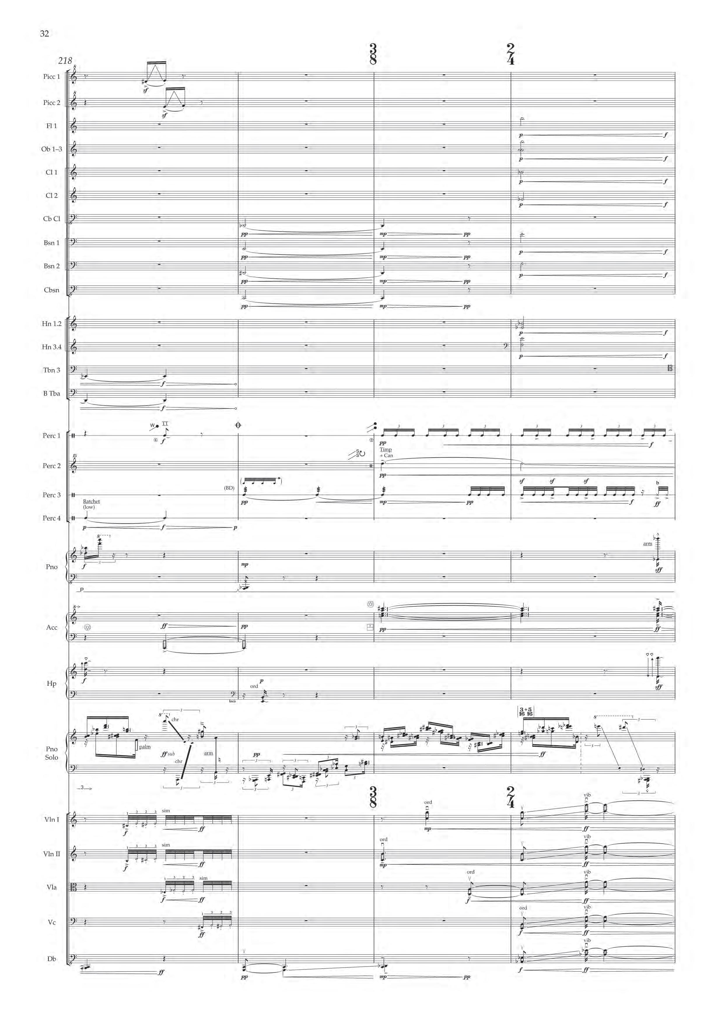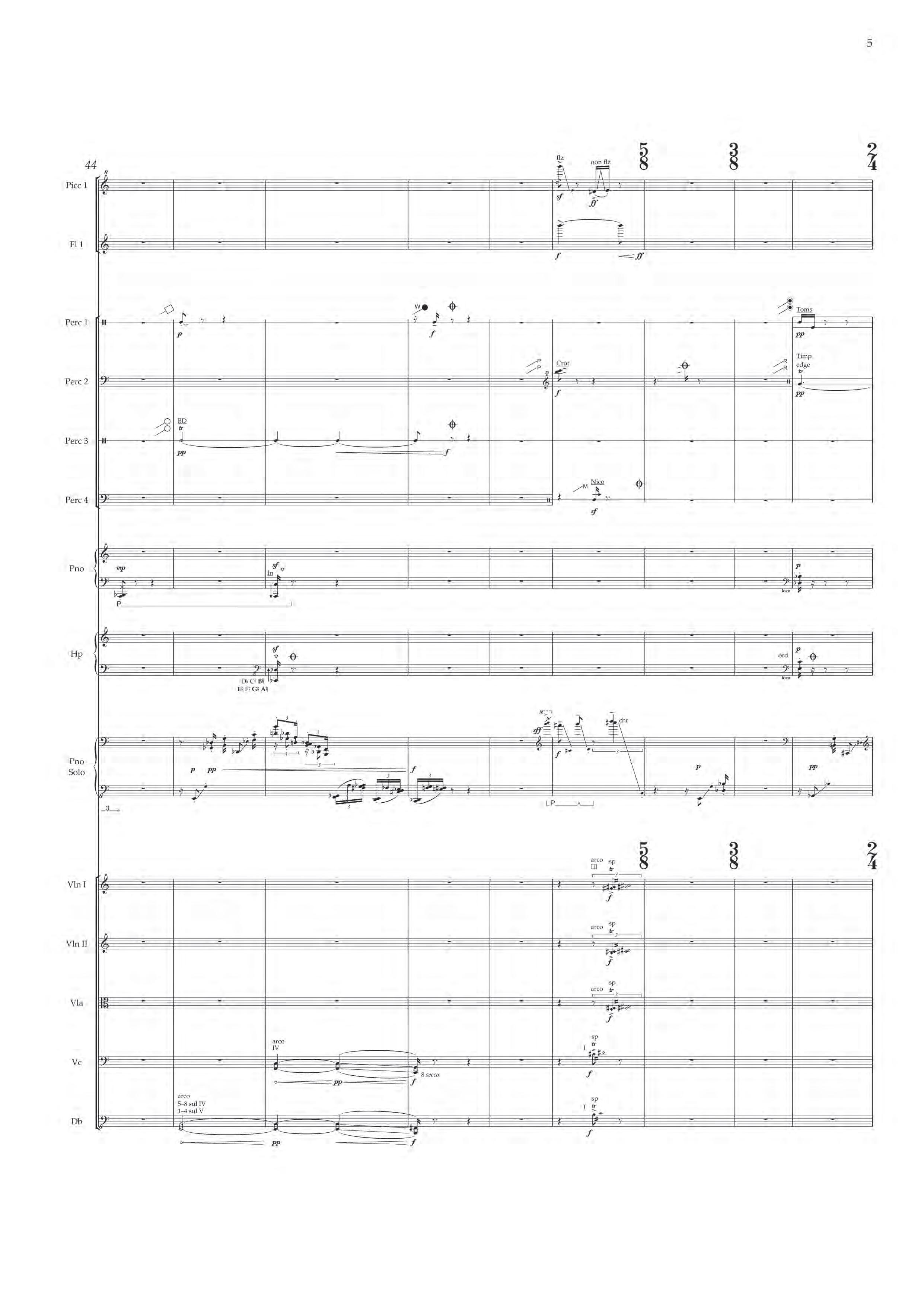 The fast sections are like a dancing fury – bring out extreme dynamic and timbral contrast at all times, and please note sudden contrast between Tempo I and more delicate Tempo II; the slower passages are always spacious, static and expressive – allow the solo piano resonances and expansive orchestra gestures to take shape before moving on.