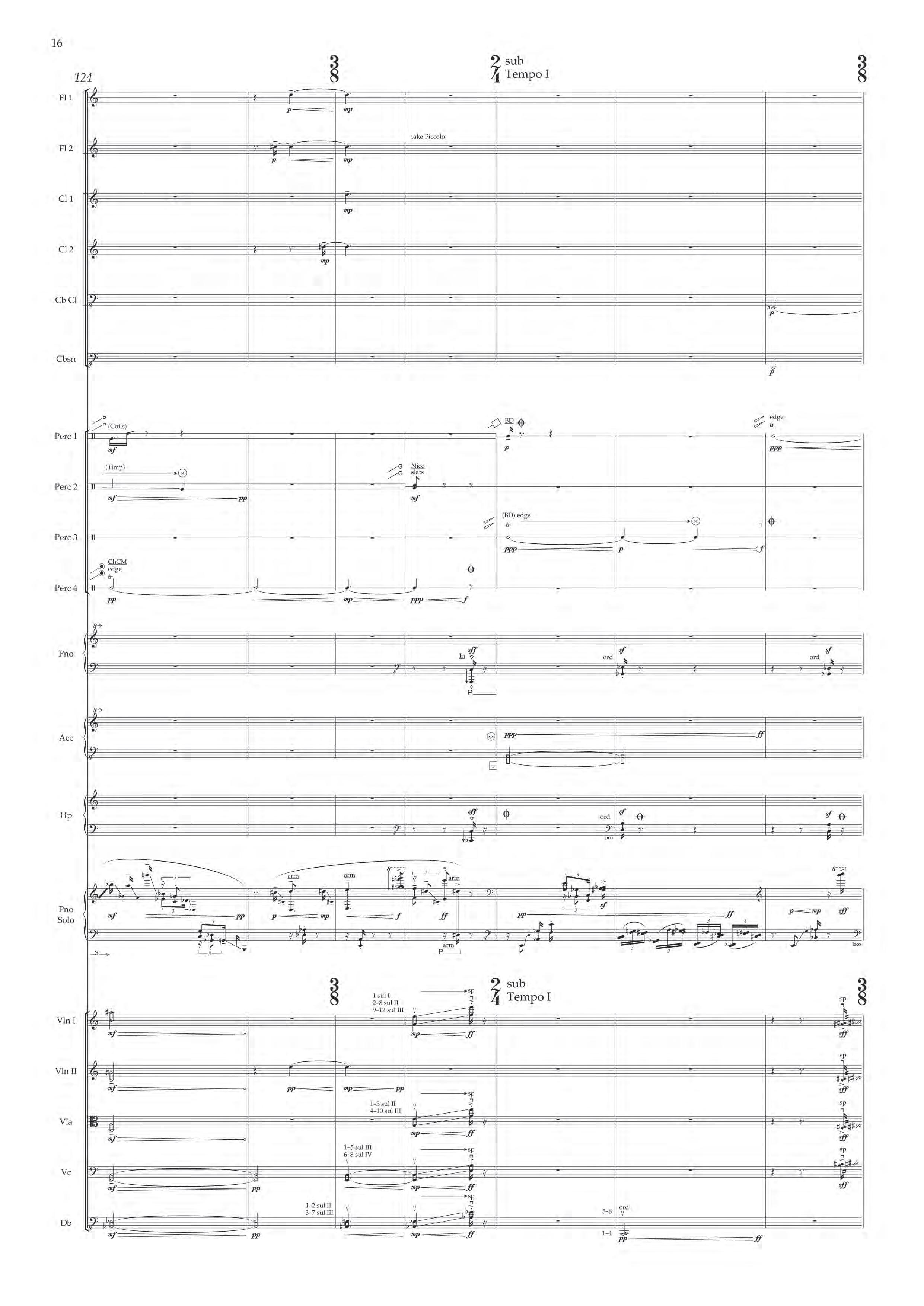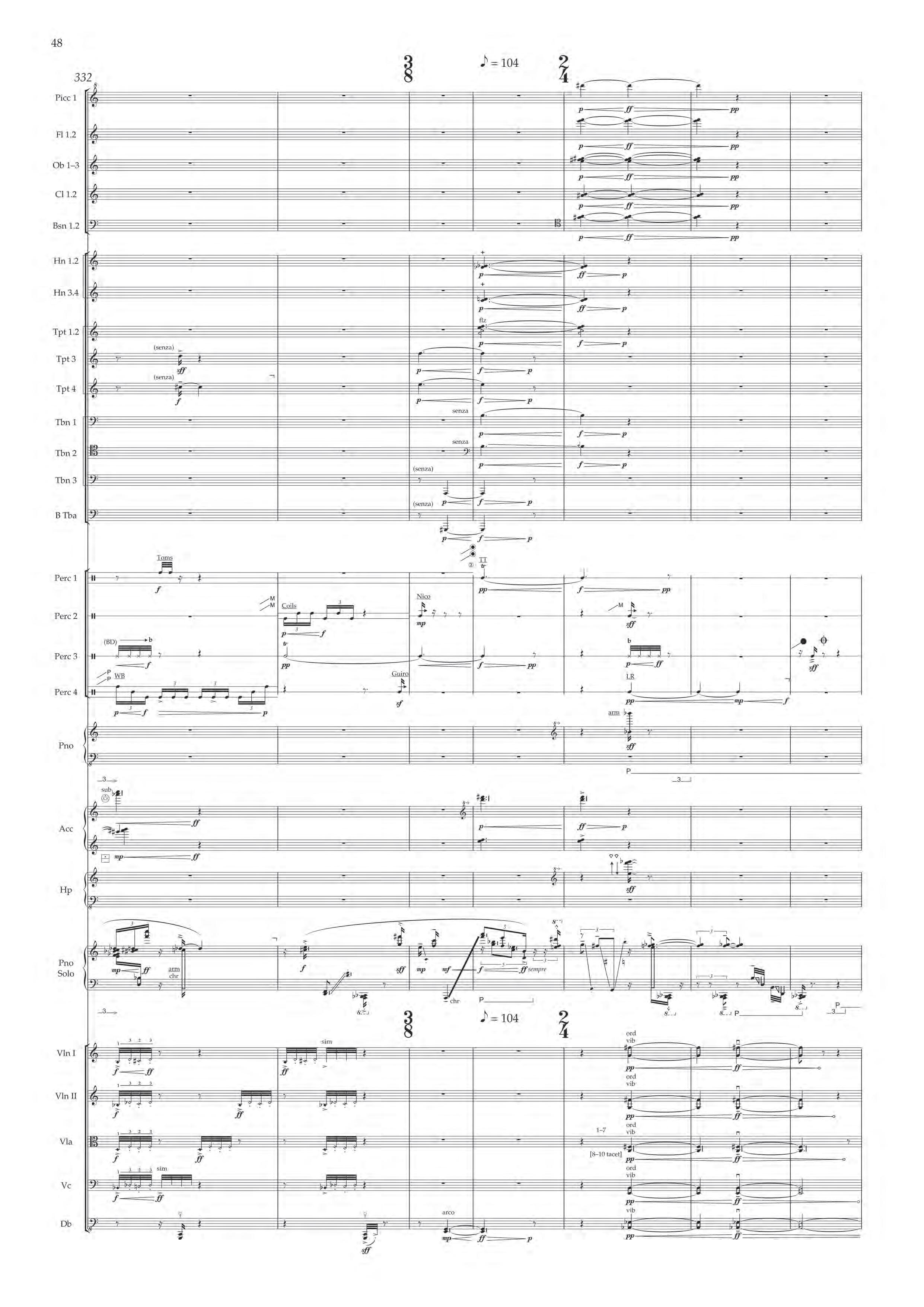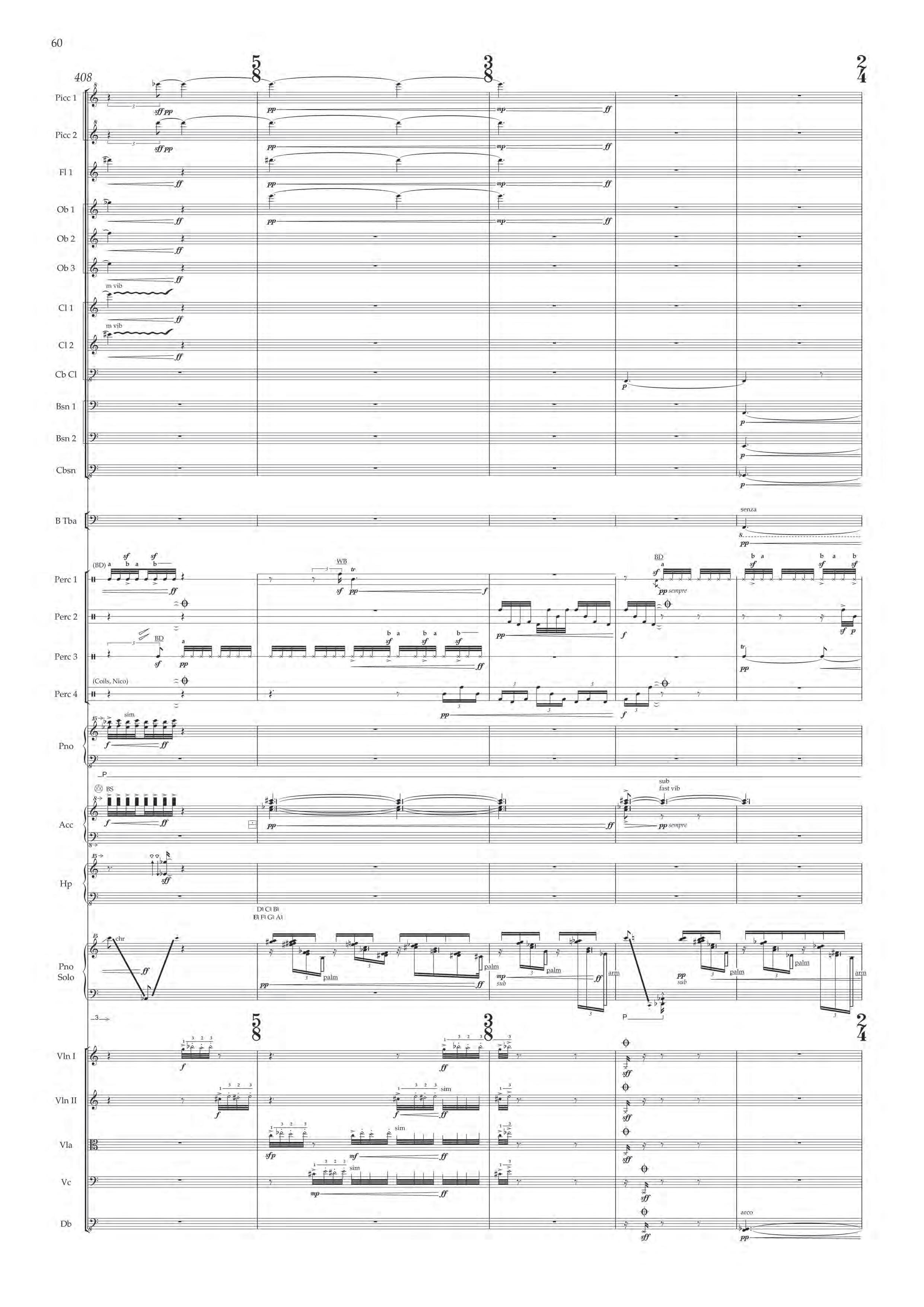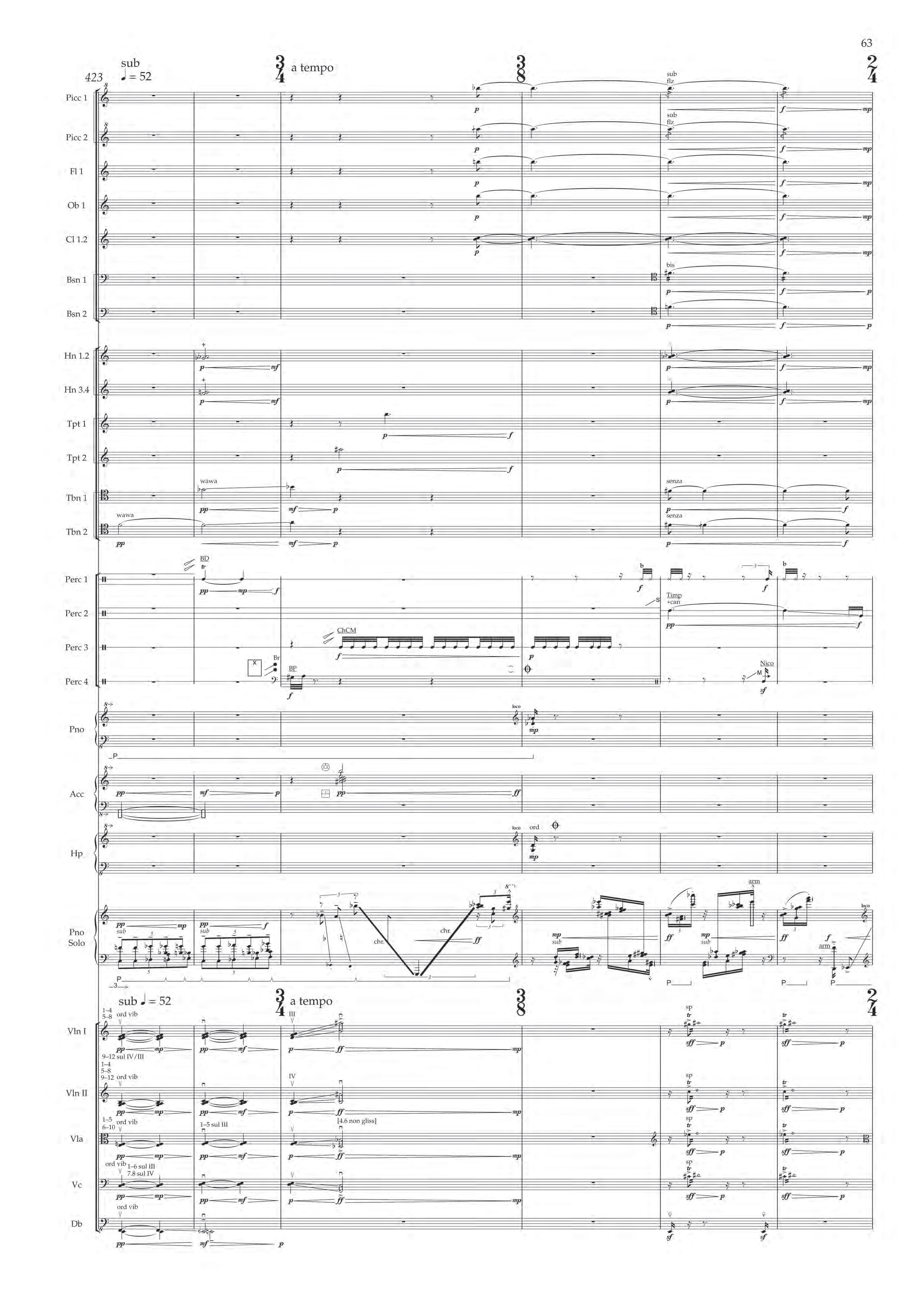 The fast sections are like a dancing fury – bring out extreme dynamic and timbral contrast at all times, and please note sudden contrast between Tempo I and more delicate Tempo II; the slower passages are always spacious, static and expressive – allow the solo piano resonances and expansive orchestra gestures to take shape before moving on.