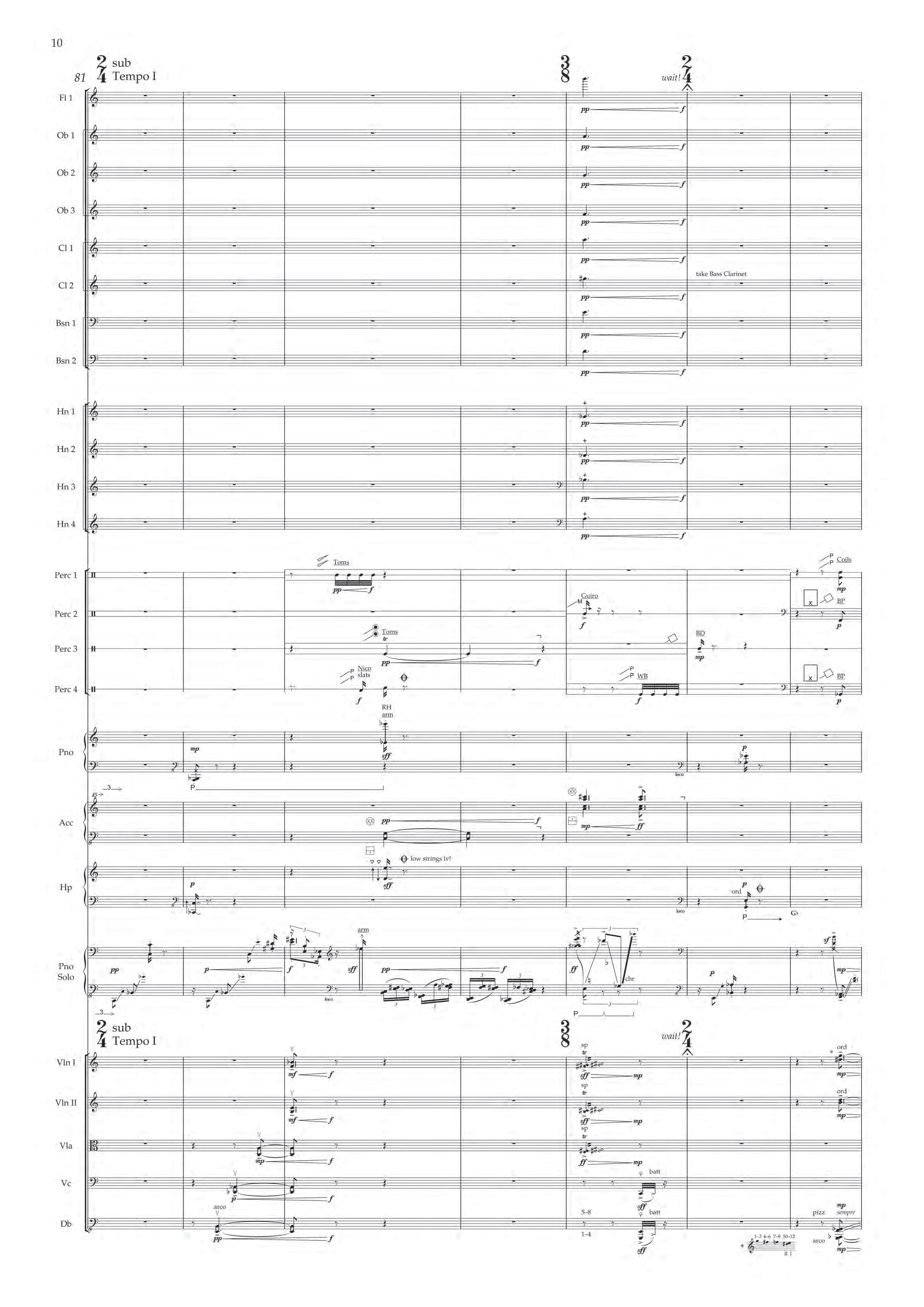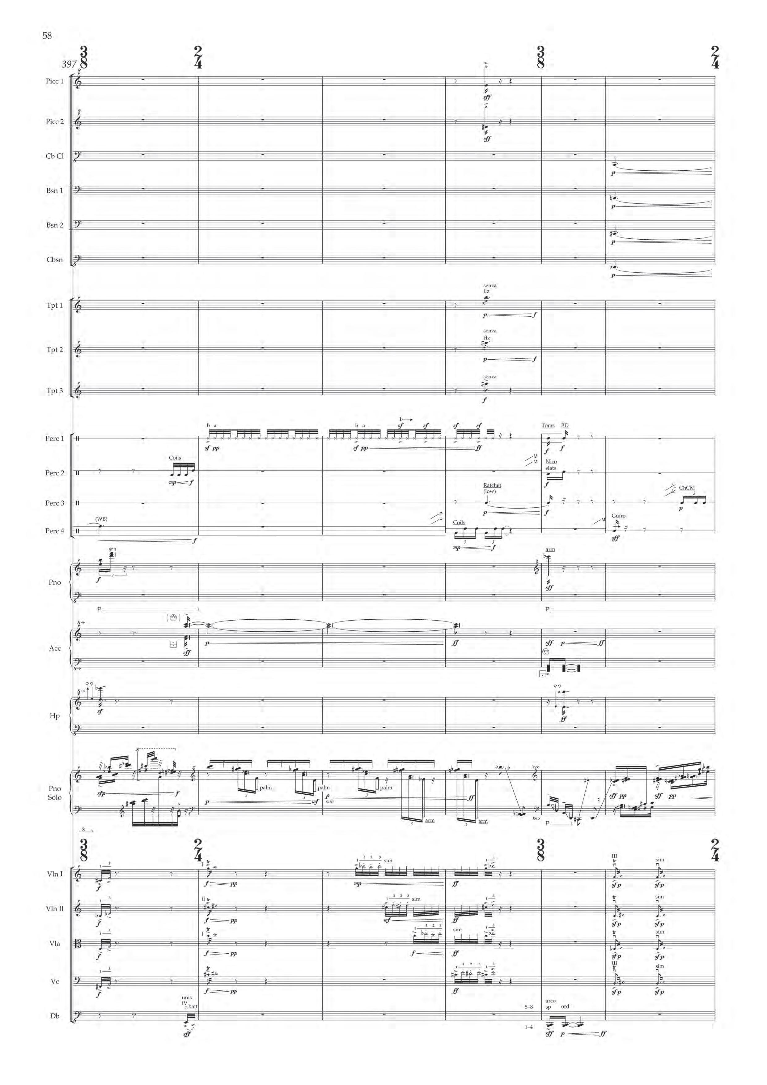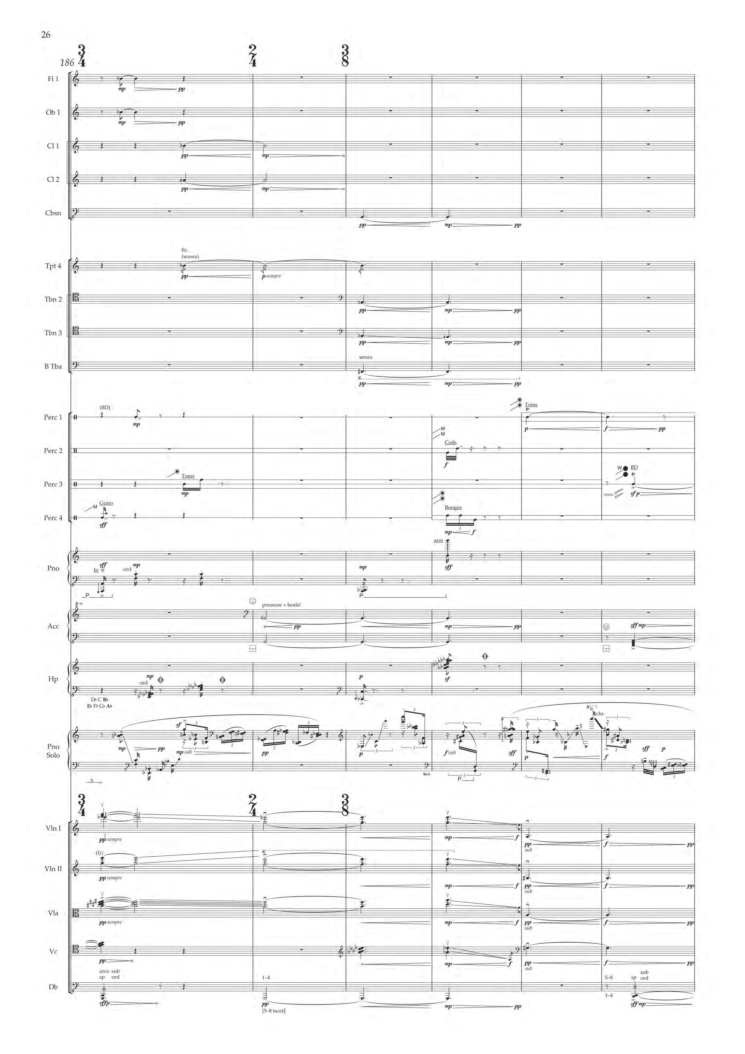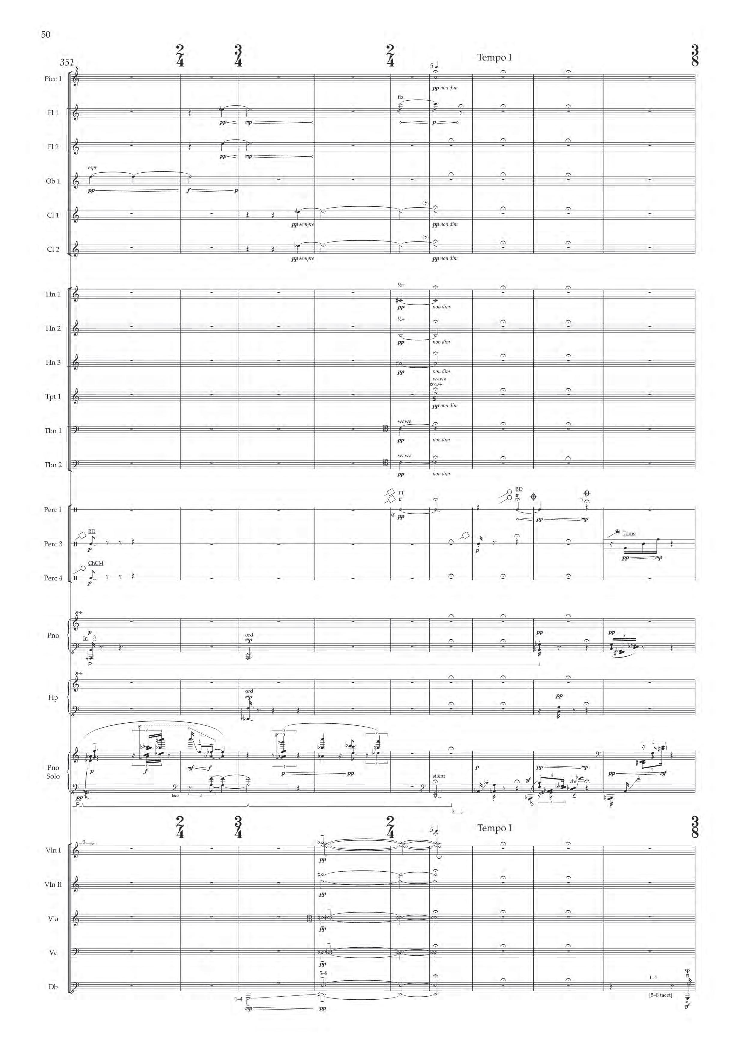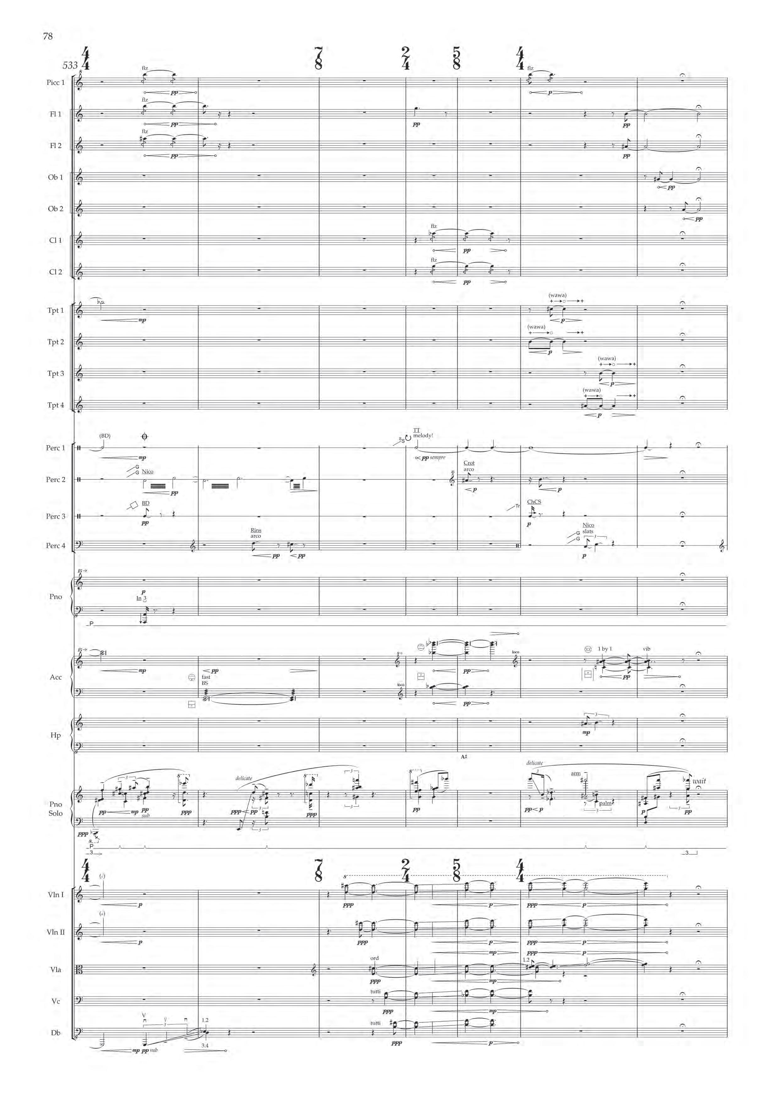 The fast sections are like a dancing fury – bring out extreme dynamic and timbral contrast at all times, and please note sudden contrast between Tempo I and more delicate Tempo II; the slower passages are always spacious, static and expressive – allow the solo piano resonances and expansive orchestra gestures to take shape before moving on.