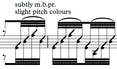This patterns appears in Part II in unison on the fourth beat in all woodwinds and percussion. The repetition of this pattern should produce an atmospheric sense of looping, a sense of leading to the first beat of the following bar(s) –to the materials played by others in the orchestra.