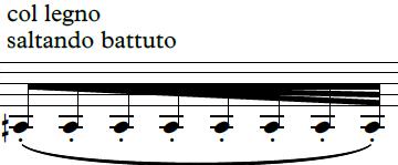 Col legno saltando battuto – when written on particular pitches the pitch comes through, when written on muted string the effect should be a pitchless attack.