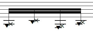 Much bow pressure performed on muted string, not on a pitch (as indicated by the notehead). When written on a short note value (sixteenth note) this should produce a non-pitched percussive attack to the muted string. The short notes on much bow pressure work best when performed close to the frog.