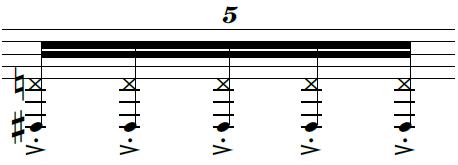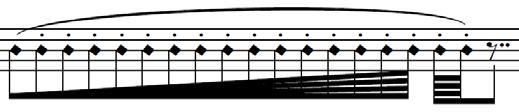 This patterns appears in Part II in unison on the fourth beat in all woodwinds and percussion. A short white noise sound on the first sixteenth note and a percussive key click on the second note. The repetition of this pattern should produce an atmospheric sense of looping, a sense of leading to the first beat of the following bar(s) – to the materials played by others in the orchestra.