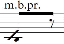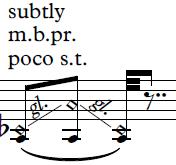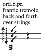 m.b.pr. – much bow pressure: apply a bit more (than ordinary) bow pressure to the string for a subtle atmospheric sustained distortion sound through continued movement of the bow. Not so much bow pressure that the flow of the bow is disturbed or that the sound becomes too aggressive.