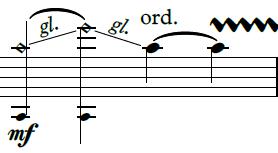 (example from the violin part, tremolo quarter notes shown): when the airy notehead is written with a glissando, slide the hand down/up the string as indicated. This will produce slight harmonic colours in the airy sound as the hand glissandos over the string(s), but the aim is for the sound to be as pitchless as possible.