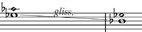 When the airy notehead is written with a glissando, slide the hand up or down the string as indicated. This will produce slight harmonic colours in the airy sound as the hand glissandos over the string(s), but the aim is for the sound to be as pitchless as possible.