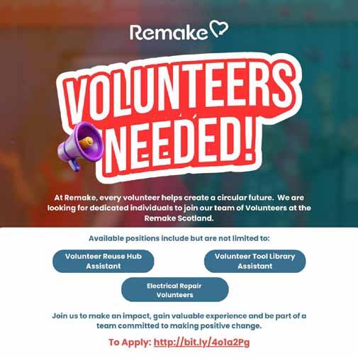 to 4 pm, with late-night shopping every Thursday until 6 pm. The Repair Hub is on Saturday, 10 January from 10 am to 1 pm at Strathearn Community Campus. You’re warmly invited to: *Explore treasures on our shop floor *Visit Food for Good on Crieff High Street *Discover our Tool Library *Join our community outreach programmes and educational events *Celebrate our 15th anniversary festivities later in the year. Donations: Thinking about decluttering, moving house, downsizing, or helping a loved one transition? We’re here to help. We accept: *Solid wood furniture (high demand!) *Items other charities can’t accept, which includes shed and greenhouse contents *Craft and art supplies *Textiles and fabrics *Artworks and vintage curios *Small electricals *DIY and gardening tools *and much more. Donations are accepted five days a week during opening hours. Every item you give helps extend the life of valuable resources and keeps reusable goods out of landfill. Start 2026 as a volunteer at Remake! If your new year’s resolution is to give back or join a charity, we would love to have you on our team. We have a wide range of roles and training opportunities for everyone, whether you’re experienced or just getting started. Want to join us? Email: info@remakescotland.co.uk. Call: 01764 655733. Let’s make 2026 a year of community, creativity, and circular change together.