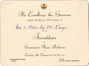 An invitation from the Governor of Western Australia, also dated 4 August 1959, to mark the Investiture of Headmaster Maxwell Keys. The reception was held at the Government House Ballroom and this invitation was then passed to Gordon Gooch and kept in the family ever since.