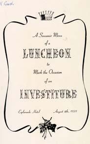 A luncheon menu dated 4 August 1959, to mark the Investiture of George Gordon Gooch at the Esplanade Hotel, Perth.