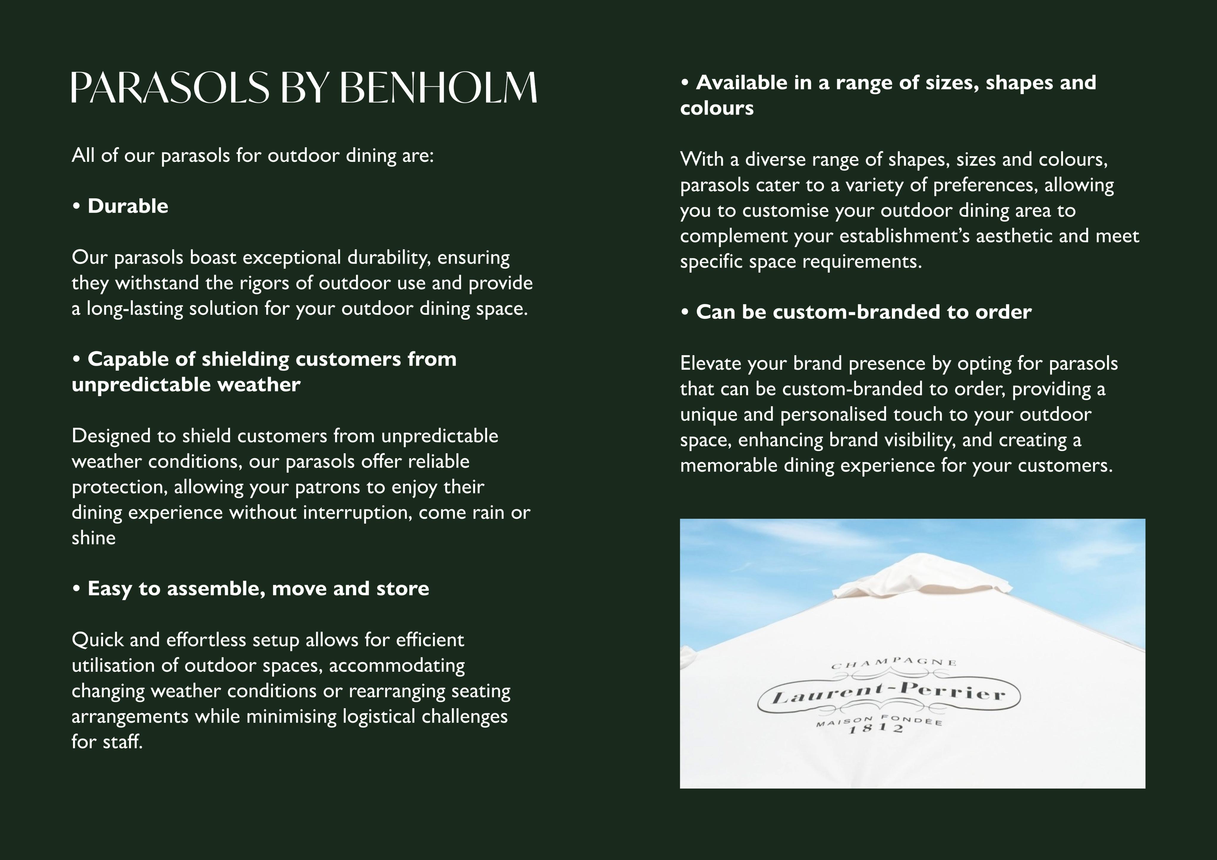 This year we are proud to continue our partnership with industry leaders, Prostor Shade Solutions and May Parasols, to offer the finest quality parasols for Hospitality.