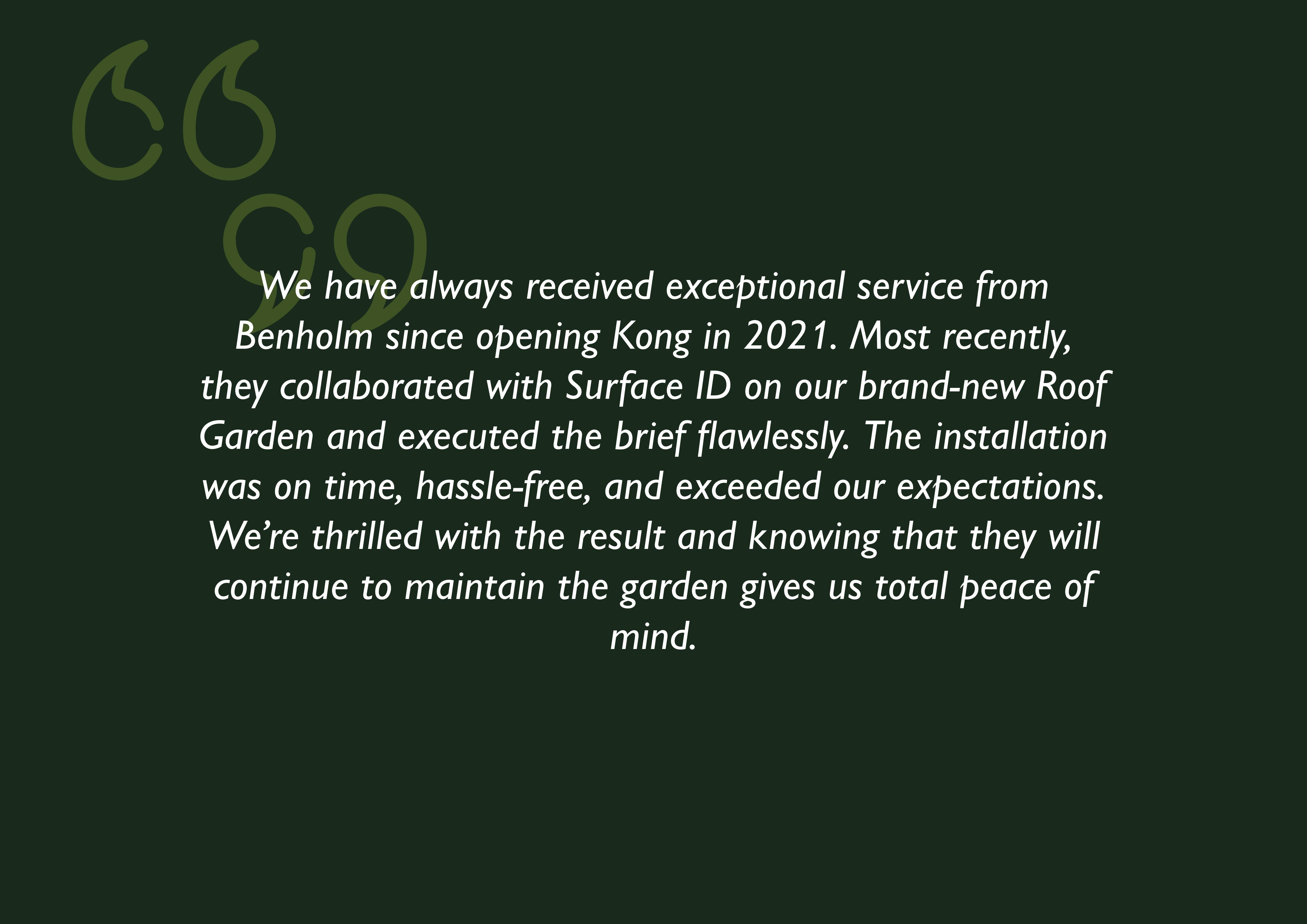 At Benholm Group, creativity is at the heart of everything we do. We craft bespoke plant displays that capture attention, embody your brand, and elevate your space. Whether you're an interior designer, architect, or hospitality manager, we'll collaborate with you to turn your vision into reality.