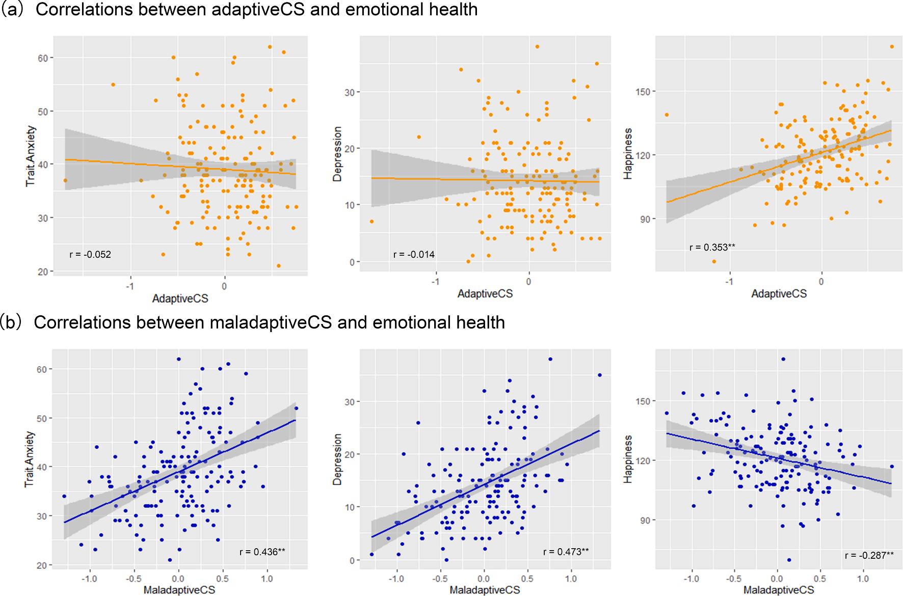 recalling negative emotional experiences. Negative self-views and depressive symptoms have also been linked to the use of self-blame or punishment, which refers to aggression toward oneself (Plaufcan et al., 2012; Vasconcelos et al., 2017). In contrast with maladaptive CS, adaptive CS include positive reappraisal—typically characterized as reinterpreting negative emotional events as positive or benign—and acceptance of emotions, which function as protective factors against psychopathology (Aldao et al., 2010; Matsumoto et al., 2008; Hofmann et al., 2010). Inconsistent ideas have arisen regarding the tendency to classify coping strategies as universally adaptive or maladaptive; some empirical evidence shows that the effectiveness of coping strategies such as sup pression and reappraisal on mental health is not uniform (Webb et al., 2012). More recent research has emphasized that coping efficacy may
