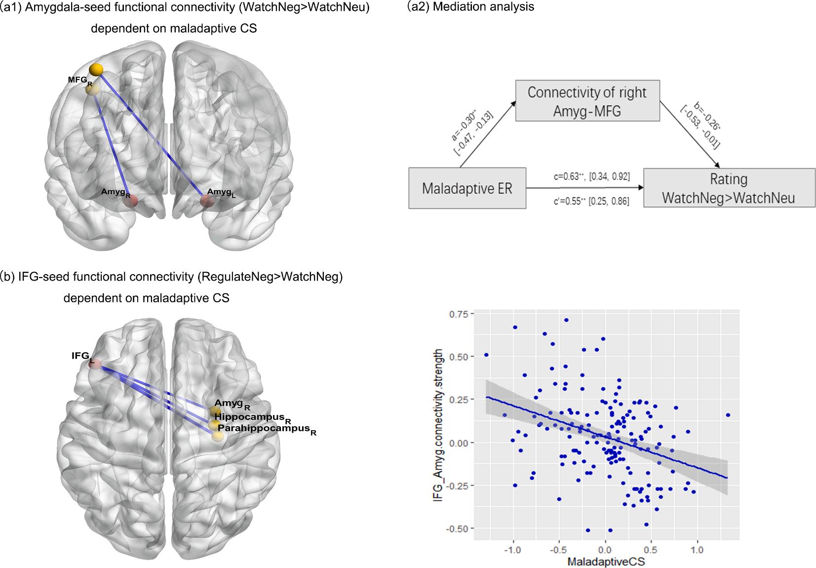 Fig. 3. (a1) Maladaptive CS was negatively correlated with FC between the bilateral amygdala and right MFG during passive negative stimulus watching (P < 0.05, whole-brain FWE-corrected), and (a2) The extracted values of FC strength of amygdala-MFG mediated the association between maladaptive CS and reduced ratings during WatchNeg > WatchNeu. (b1) During down regulation processing, maladaptive CS use was negatively correlated with FC between the IFG and right amygdala (voxel-wise threshold level of p < 0.001 uncorrected and a cluster-level threshold of p < 0.05 FEW). CS = coping style, FWE = family-wise error, MFG = middle frontal gyrus, IFG = inferior frontal gyrus.