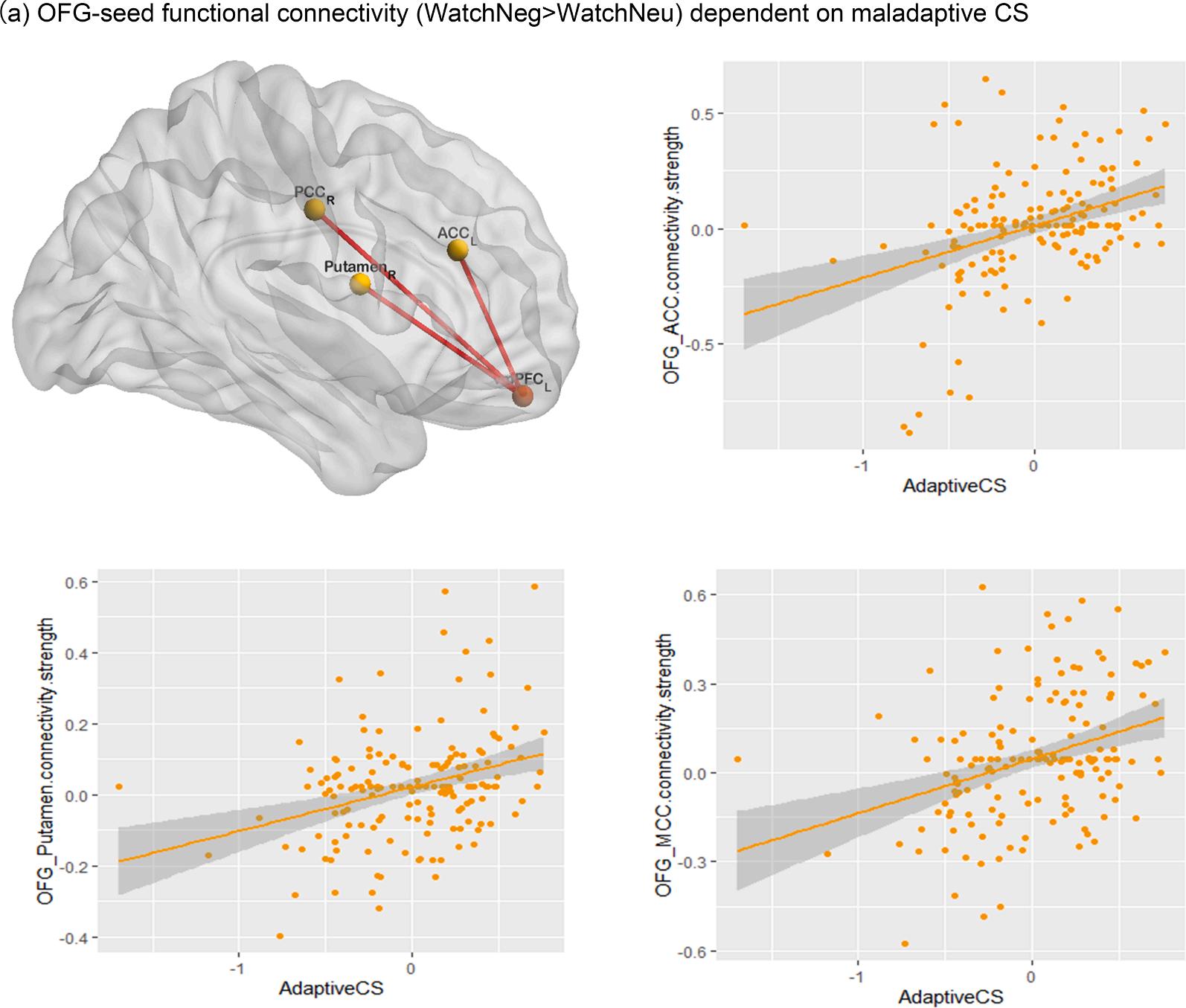 Adaptive CS might involve the suppression of negative stimuli- elicited retrieval, which is supported by the attentional control mechanism recruited by functional connectivity in PFC regions and the ACC (Depue et al., 2016; Guo et al., 2018). Our results suggested that dependent on levels of adaptive CS, the OFC showed greater functional connectivity with ACC, MCC, and putamen. The OFC seed in our study is considered anatomically synonymous with the vmPFC (Blair, 2007). Previous research suggested that appraisal and expression of negative emotion might recruit activity of dorsal-caudal regions in the ACC and mPFC, while ventral-rostral portions of the ACC and mPFC seem to have a direct regulatory role on emotional responses involving subcortical regions (Etkin et al., 2011; Li, Biswal, et al., 2019, Li, Duan, et al., 2019). A number of studies have revealed the important role of connectivity between the ACC/MCC and vmPFC in detecting emotion conflict and modulating activity in the amygdala (Banks et al., 2007; Egner et al., 2008; Etkin et al., 2006). This conflict-driven regulatory mechanism likely facilitates positive appraisal, which competes with the initial negative emotional appraisal during the valuation process. The MCC and putamen is involved in monitoring reward response behavior (Haber, 2017; Haruno & Kawato, 2006) and punishment avoidance (Vogt, 2009), and has been suggested to play a crucial role in facilitating intentional motor control over emotional responses (Felix et al., 2013). Adaptive strategies, such as reappraisal, likely rely upon conscious control over affect-related attention and involve recruitment of a top- down dorsal attention system from the dlPFC to ACC/MCC (Kohn et al., 2015; Ligeza et al., 2016). In line with this idea, we speculate that adaptive CS might include trait-like tendencies that involve attentional deployment and reward monitoring during emotion regulation.
