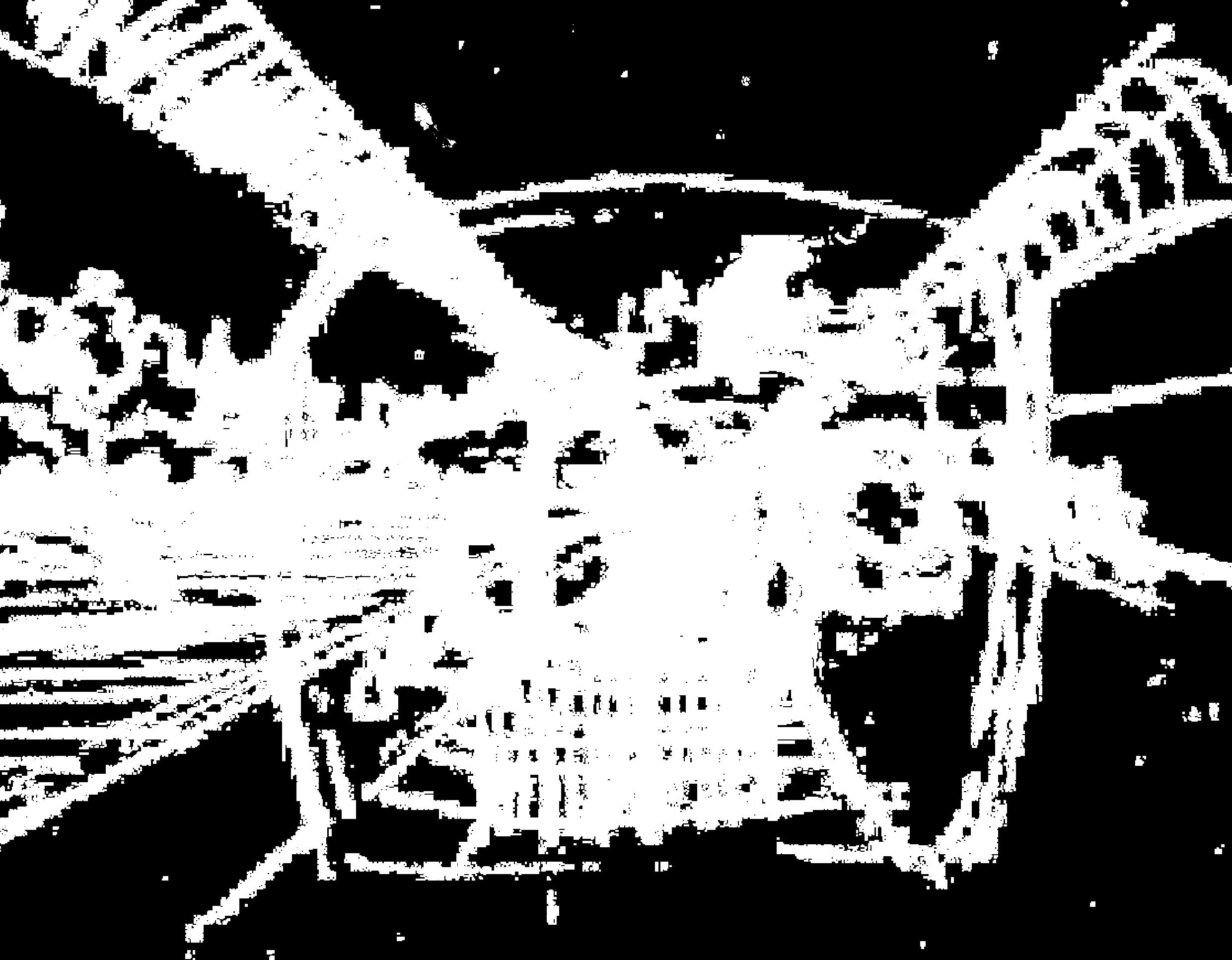 “A digital landscape of modular scaffolds, fabric membranes, suspended walkways, and stagelike structures for augmented reality.”