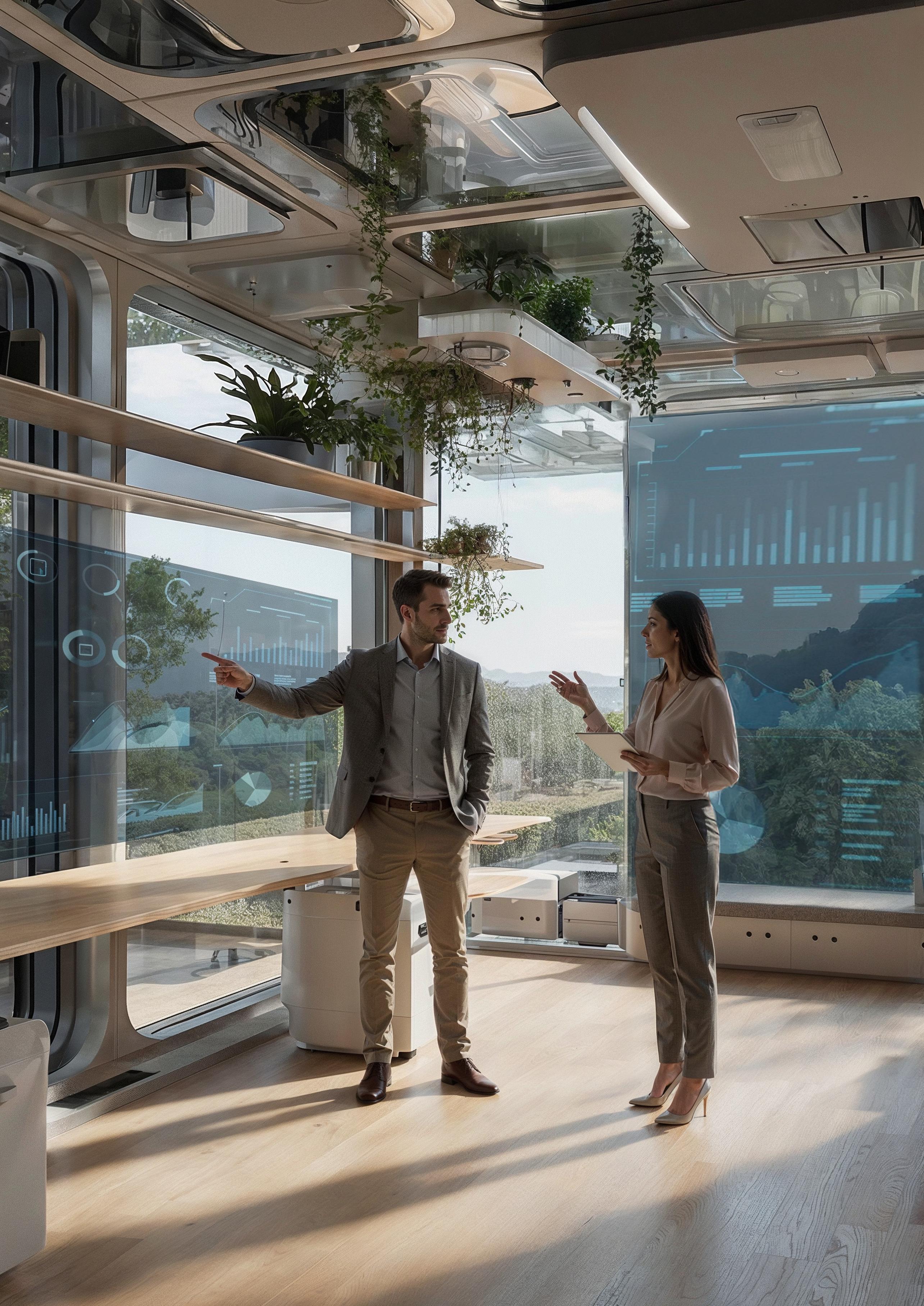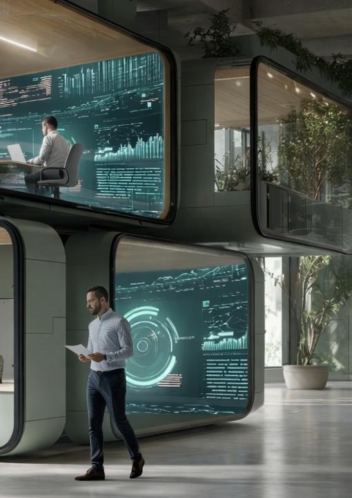 Dawn in the city no longer came with the hum of cars but with the soft shifting of façade-skins as buildings filtered the morning air. The Hive, a vast retrofitted church in the heart of the old financial quarter opened its responsive shutters, flooding the nave with filtered daylight. The bioengineered walls pulsed faintly as they generated energy, shading, and oxygen all at once. Inside, Amy an intern, stepped into the vestibule. She didn’t carry a laptop. Her workspace - even her tools - would appear as needed. The building recognised her presence, scanned her heartbeat, mood, and the quality of her sleep. The stone columns around her rippled with projected moss and bird song, the environment shifting to calm her nerves. “Welcome back Amy,” said the building’s AI steward, its voice warm and nearly human. “Would you like a ‘focus’ setting or a ‘collaborative’ one this morning?”