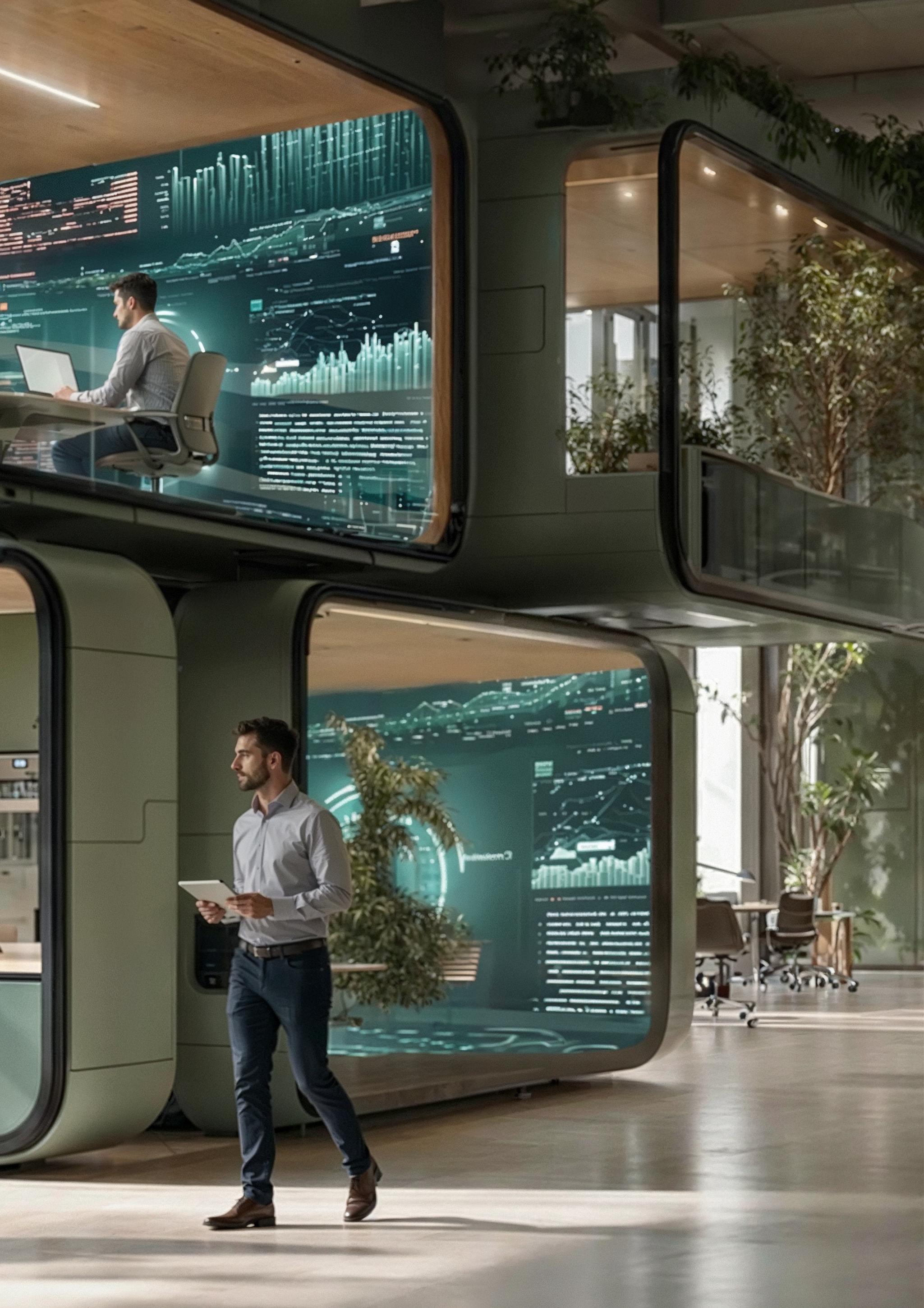 “Collaborative,” she replied quickly. She wanted to belong. Her environment shifted instantly as long tables slid out of the floor, glass partitions softened into translucency, and a faint aroma of coffee and eucalyptus filled the air. Across the nave, a cluster of workers were already laughing, some physically present and some shimmering as holograms; avatars indistinguishable from their three-dimensional selves until you looked more closely.