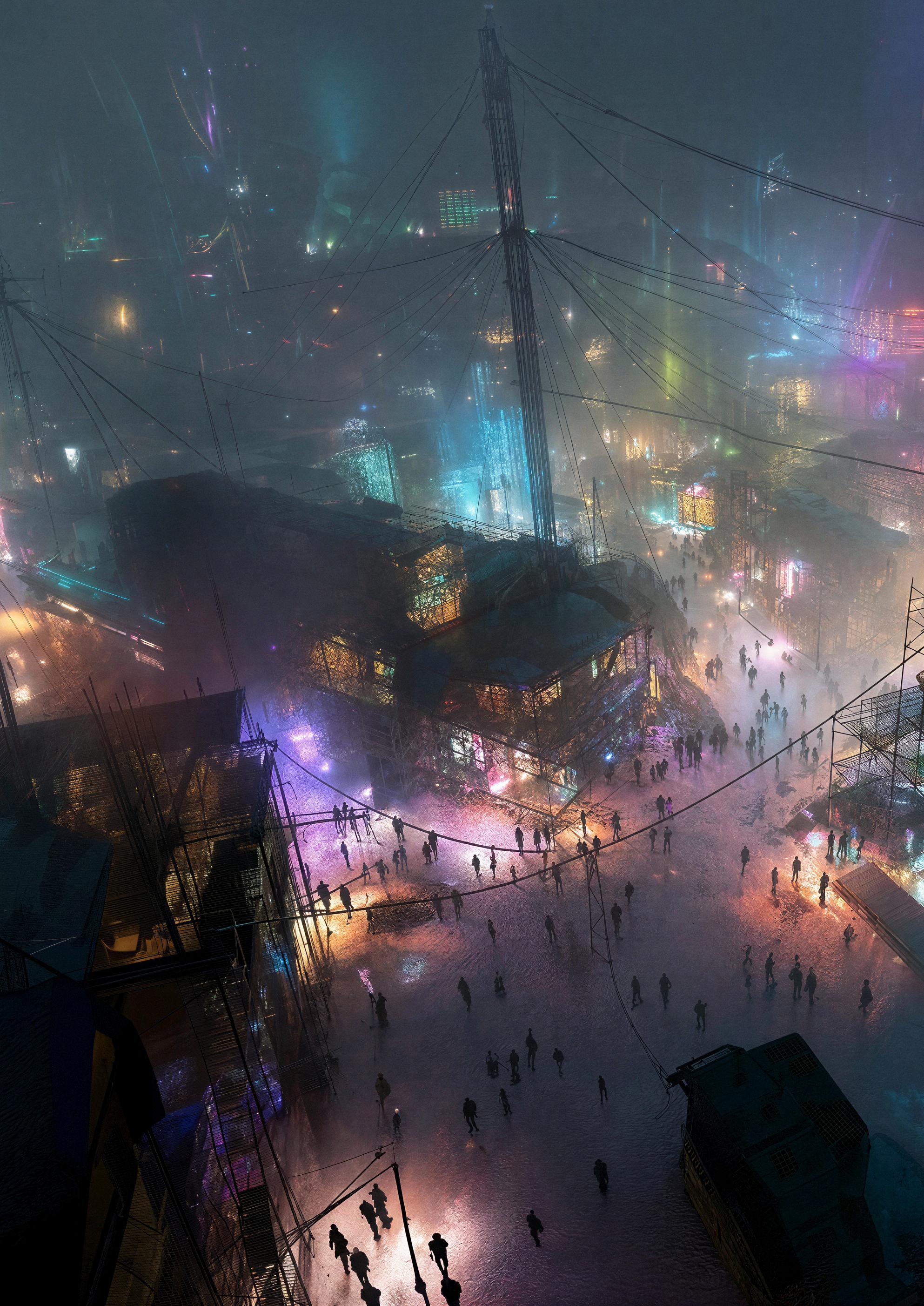 Bioluminescent algae light the walkways with a soft pulse of green and blue. Families gather in the civic hall where a concert streams, carefully compressed so as not to strain the community’s shared energy pool. Children dance while their parents watch the consumption meter tick down.