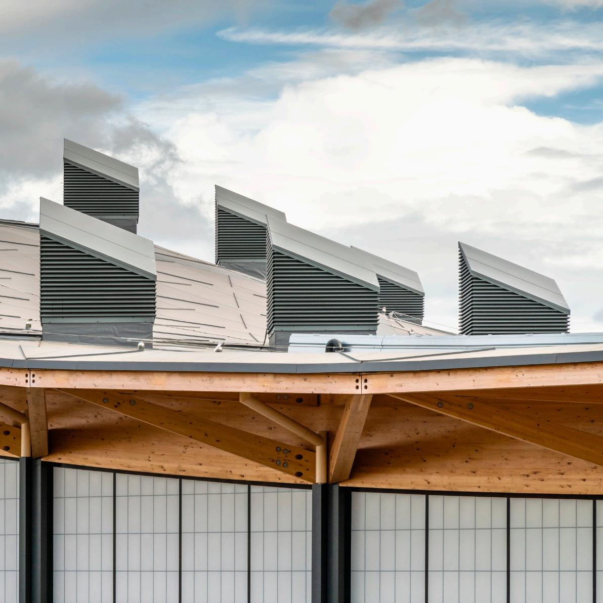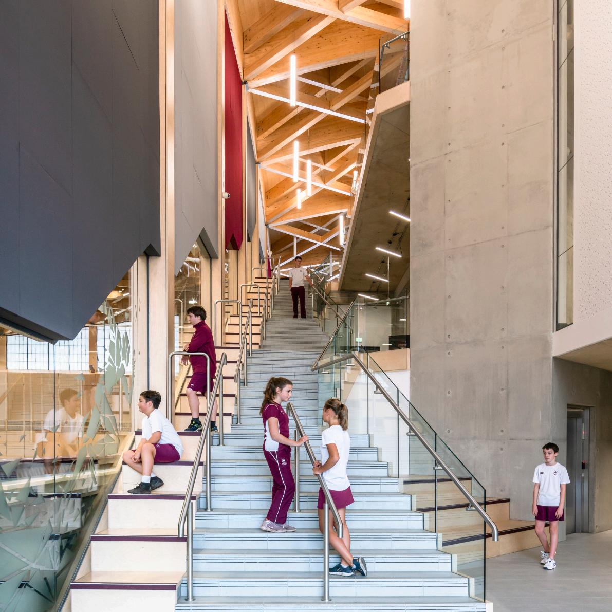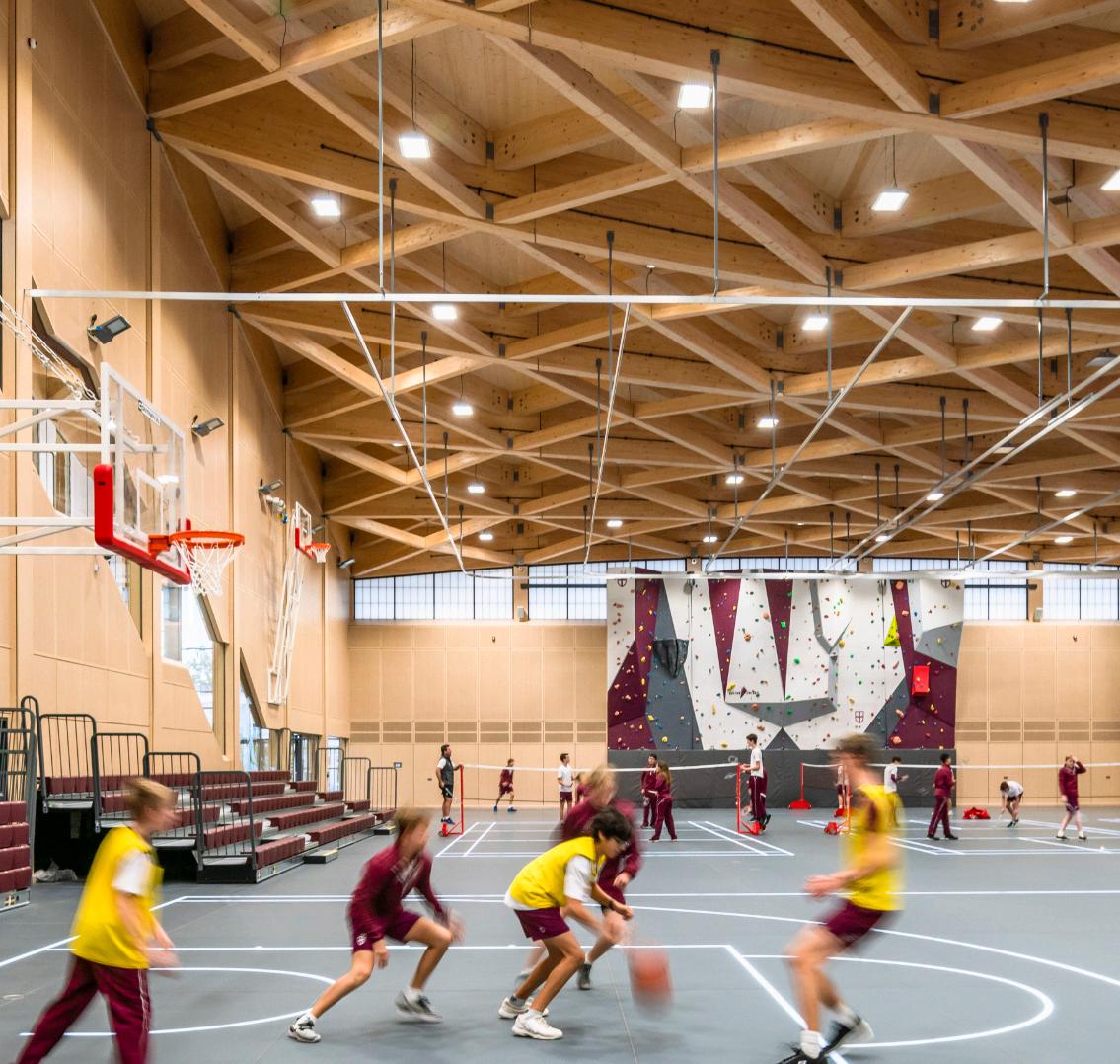 Completed in 2019, St George’s College Activity Centre (pictured left) is located in Weybridge. The 4,000 sq m, threestorey building provides an inspirational environment for students and community engagement by supporting the school’s vision to deliver ‘activity for all’. Its innovative, freeform glulam roof creates a wave-like form that reduces embodied carbon, contributes to a low-energy environment, and blends into the landscape.