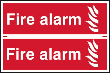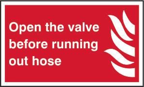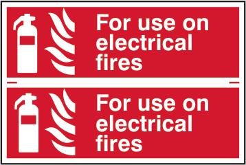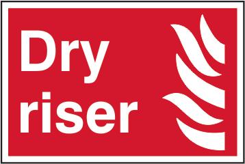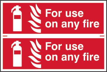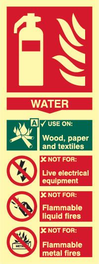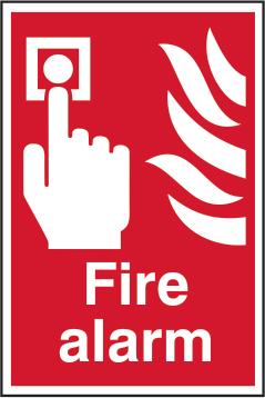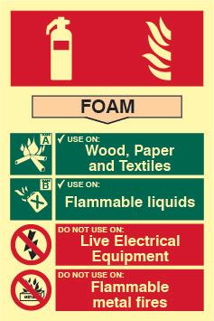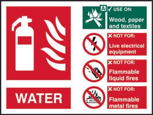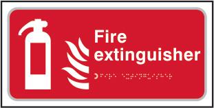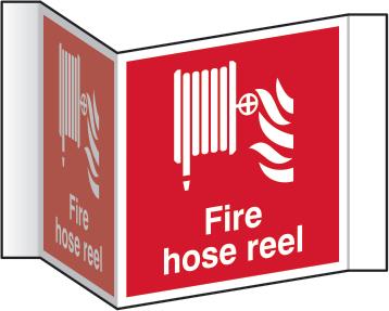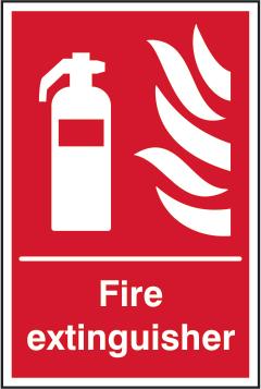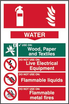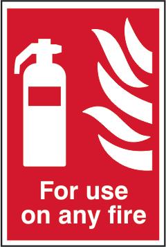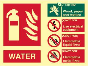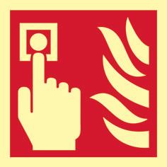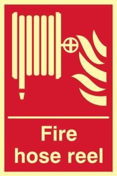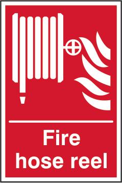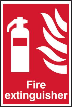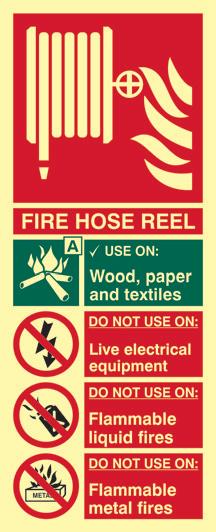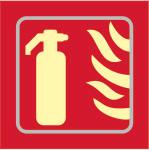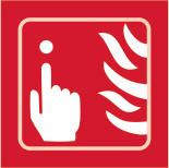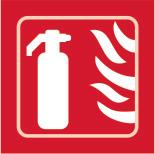 A red rectangle or square with a symbol or text in white providing information about the location and use of fire fighting equipment.