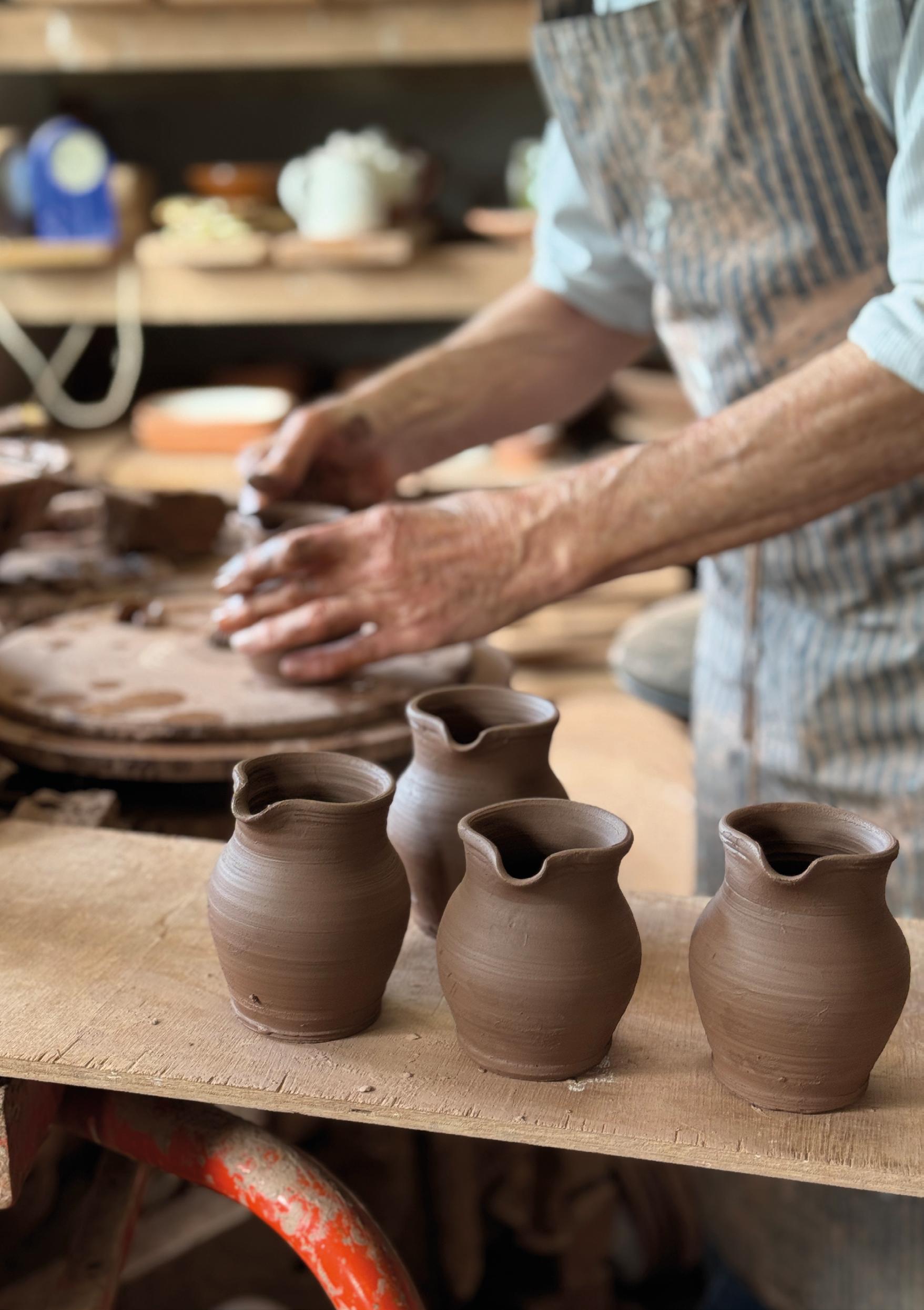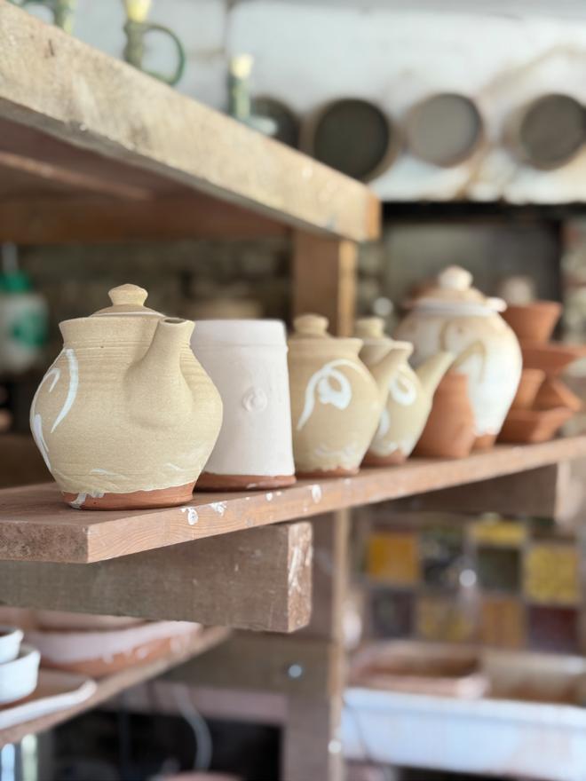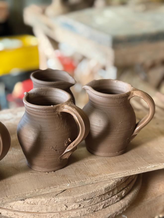 of movement. Clay is cut and weighed after consulting his notebook. Plates are turned, handles pulled, surfaces decorated. What looks effortless is the result of decades of practice. Larger, one off pots are approached more slowly, balanced alongside the steady making of bowls, jugs, dishes and plates intended for daily use. The work is measured and purposeful, rooted in repetition and refinement.