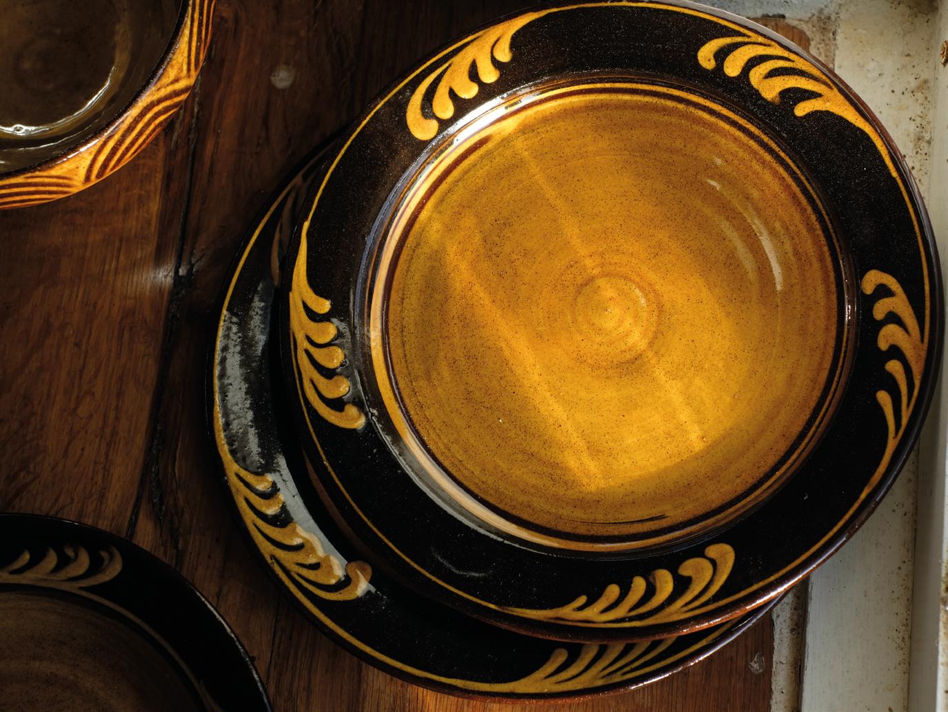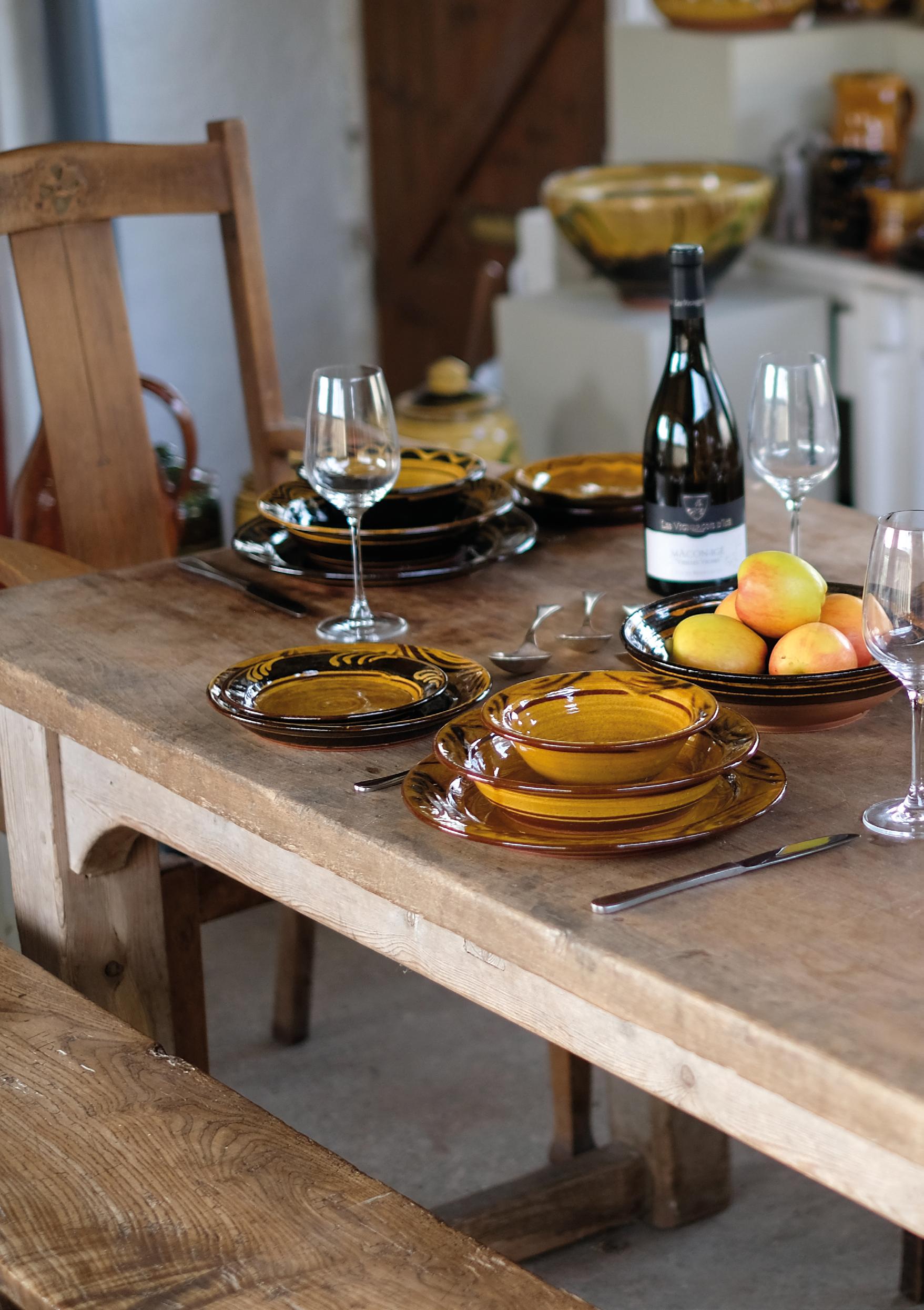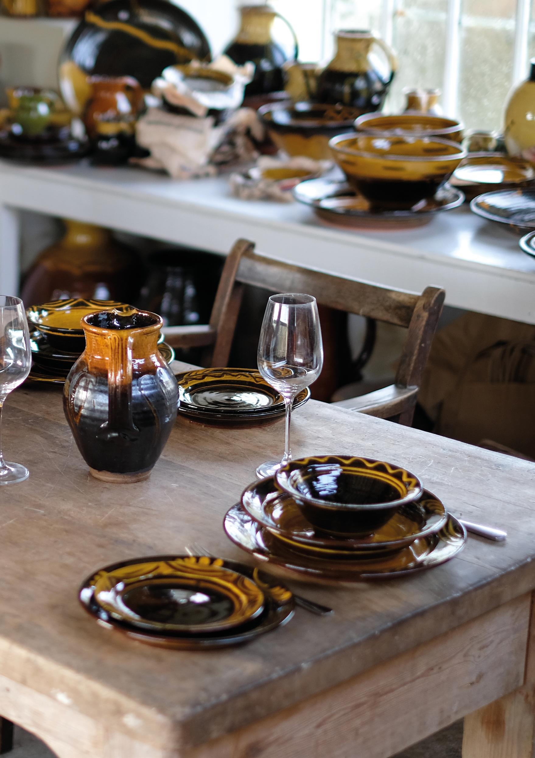 The palette has stayed deliberately narrow. Black, creamy white, green and ochre slips have proved sufficient. Working within this limited range allows attention to fall on the proportion, gesture and balance of each and every pot. The character of a jug or dish emerges through line and surface rather than colour.
