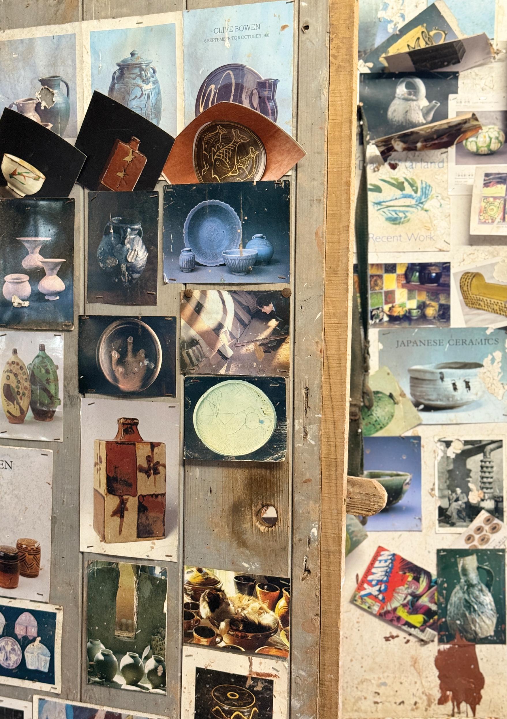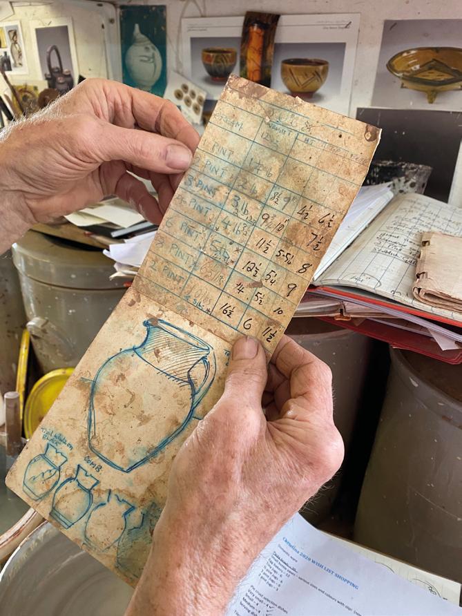 Clive Bowen can often be found in his pottery at Shebbear, surrounded by pots at various stages of completion, a job he has been doing with quiet determination since 1971. Some pots are newly thrown and still damp beneath their cloths. Others stand drying on boards, their surfaces ready for slip. Nearby, shelves hold work waiting for the kiln. The rooms Bowen works in carry the marks of long use. The walls are covered with pinned sketches, measurements, glaze tests and working notes accumulated over decades. Nothing is decorative. Everything has a purpose.