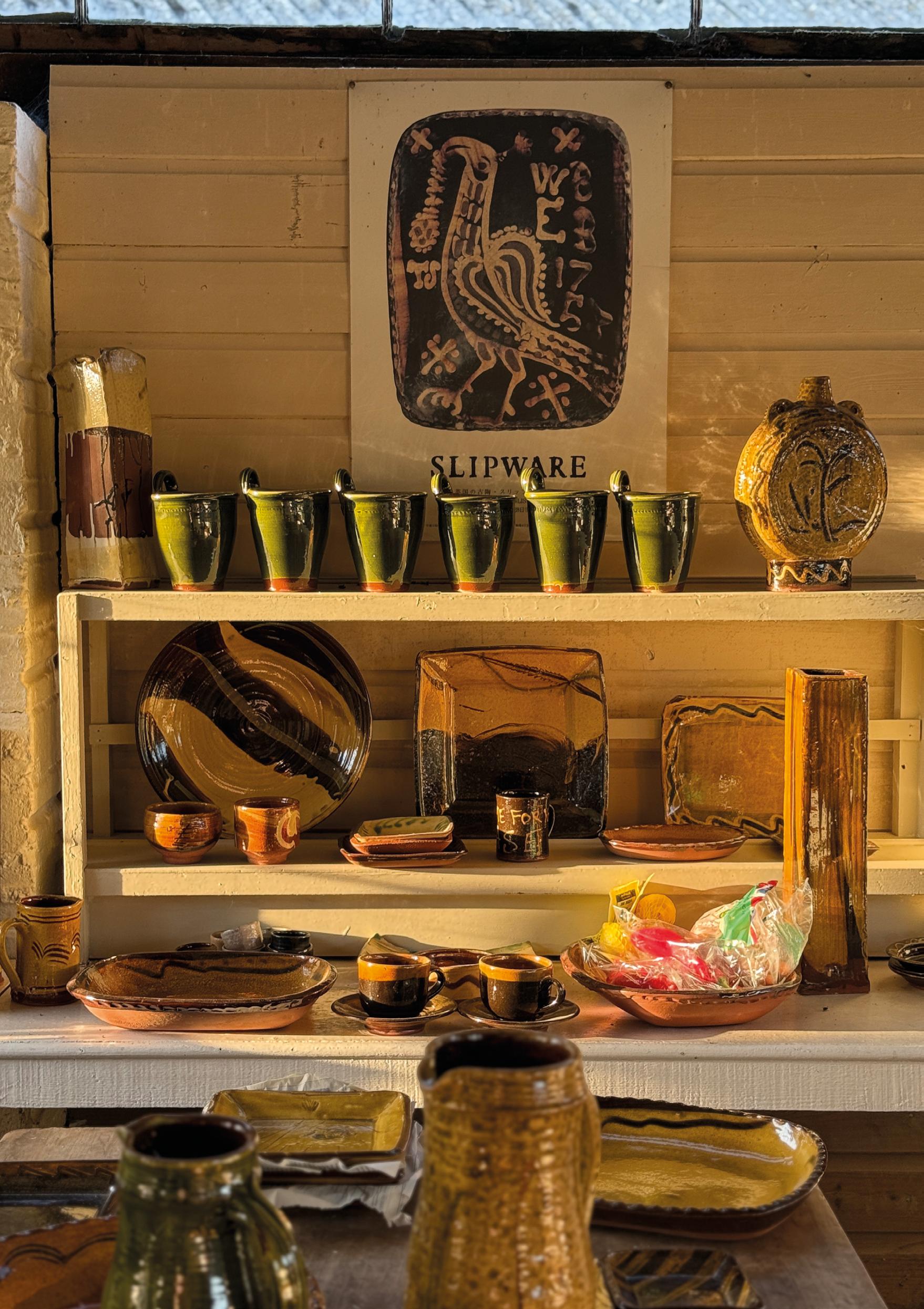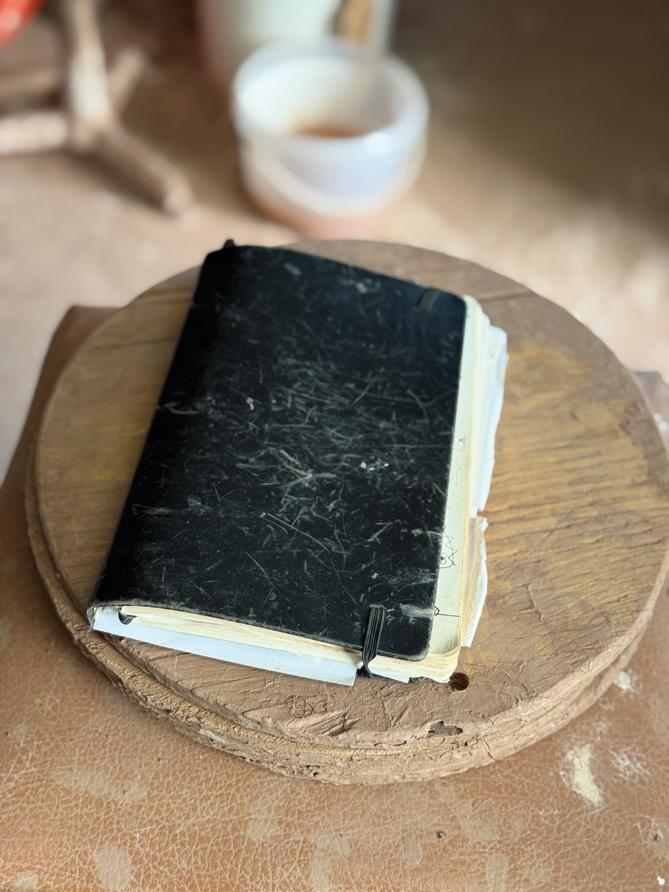 The studio functions as both workshop and memory. Books on early English pottery sit alongside dog eared notebooks filled with glaze recipes and firing records. There are pages recording weights of clay, adjustments to slip thickness, small changes made after a firing that did not go as planned. Upstairs, earlier pieces are kept carefully, forming an informal archive of work that has evolved slowly over time. A jug from thirty years ago may sit beside one made last month, the differences subtle but telling. Change happens gradually. Continuity holds everything together.