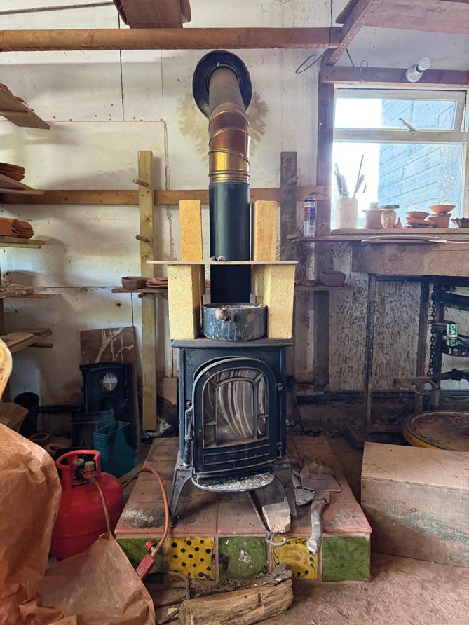 through his wood, using its rich ochre slip alongside black, creamy white and green, a deliberately limited palette that has become a defining strength. Fremington clay, long used by North Devon potters, is blended with a red Stoke clay and local silver sand from the Cornish china clay industry, giving his pots their distinctive texture and vitality.