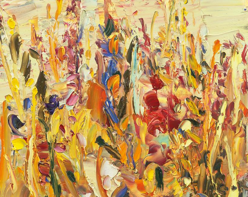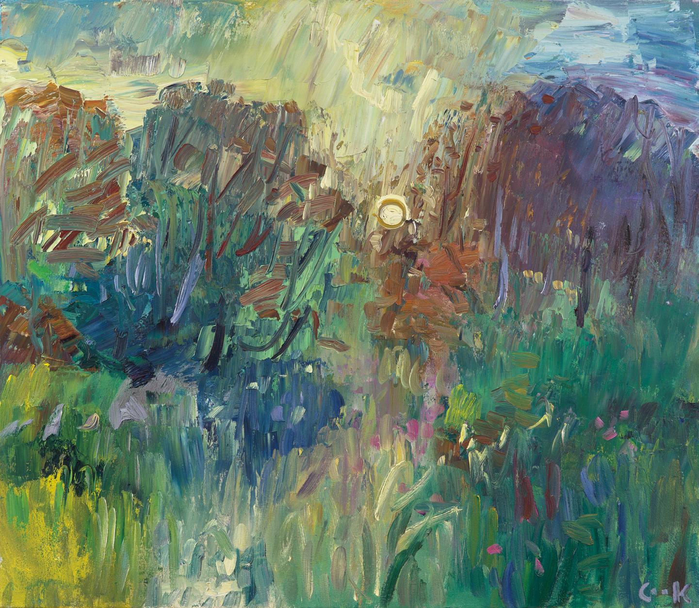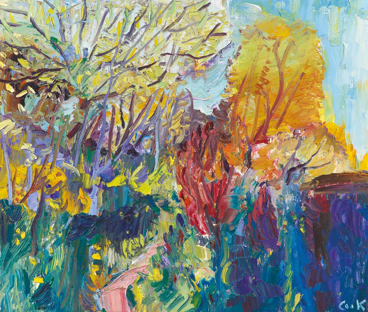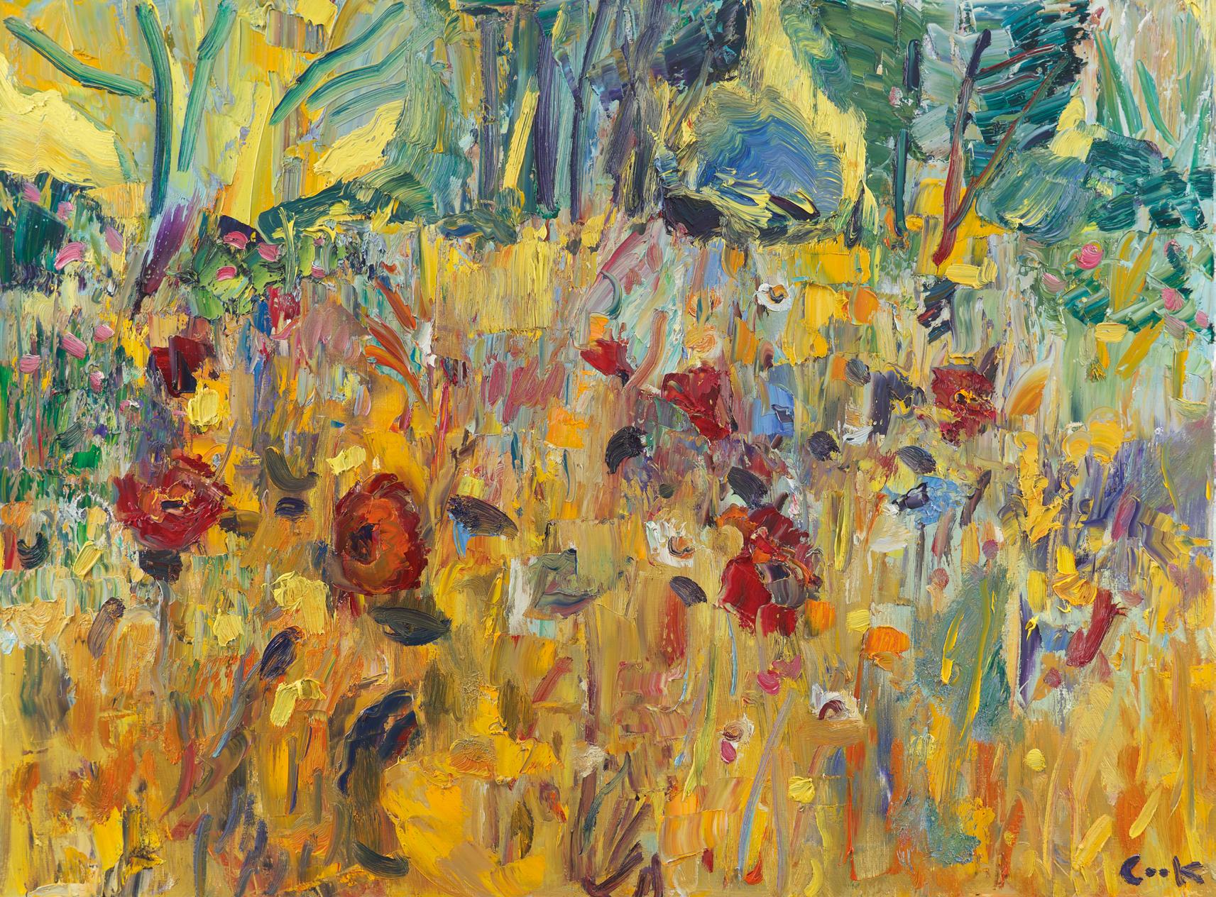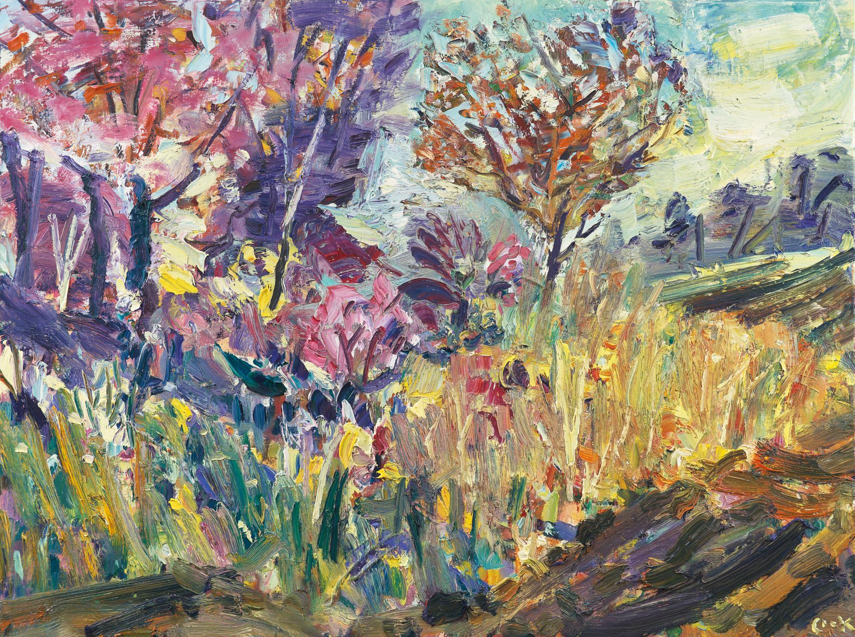 The paintings in this exhibition chart the turning of the year, with particular intensity in spring and autumn, when colour reaches its most heightened pitch. In spring, the shock of new greens and blossoms arrives against the winter’s restraint; in autumn, ochres, crimsons and deep umbers flare before retreat. Cook’s handling of oil paint, laid on in rich impasto, mirrors this vitality. The surface of each canvas carries the energy of its making, paint worked and reworked until it holds the sensation of wind through stems or the golden arc of a sinking sun.
