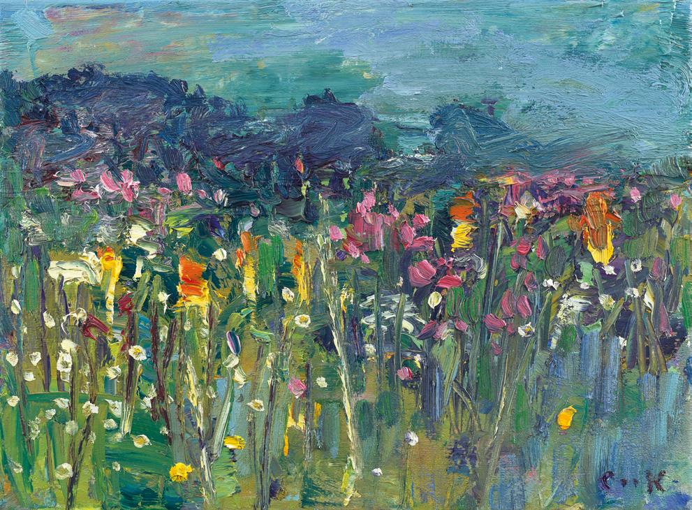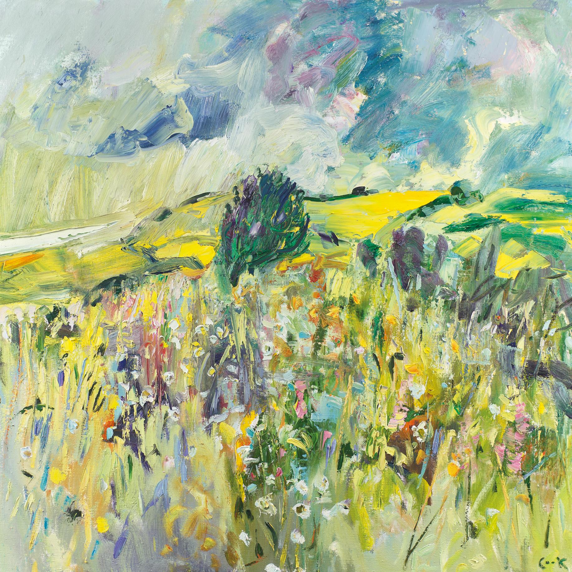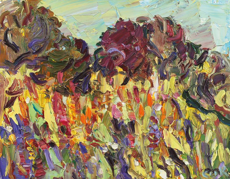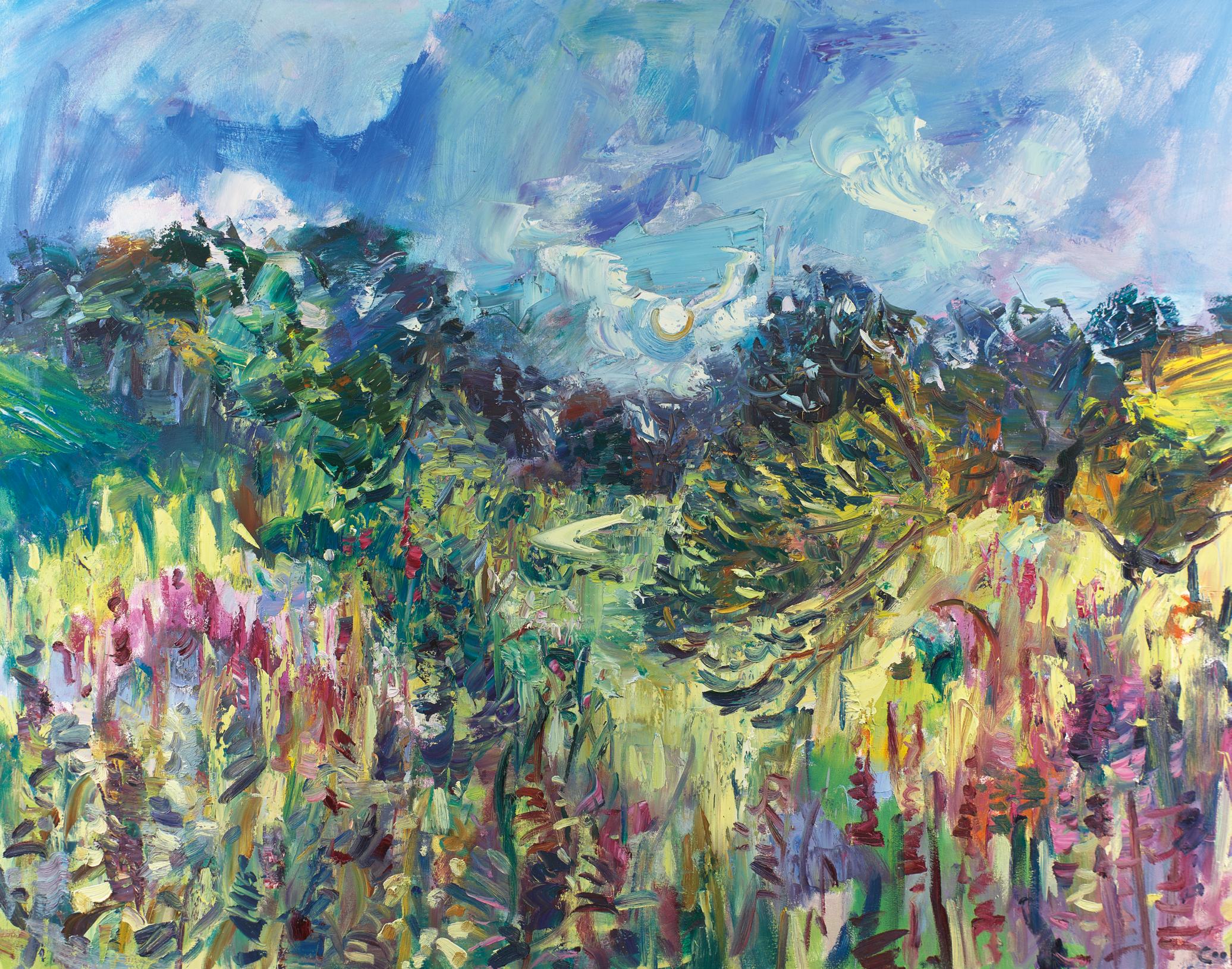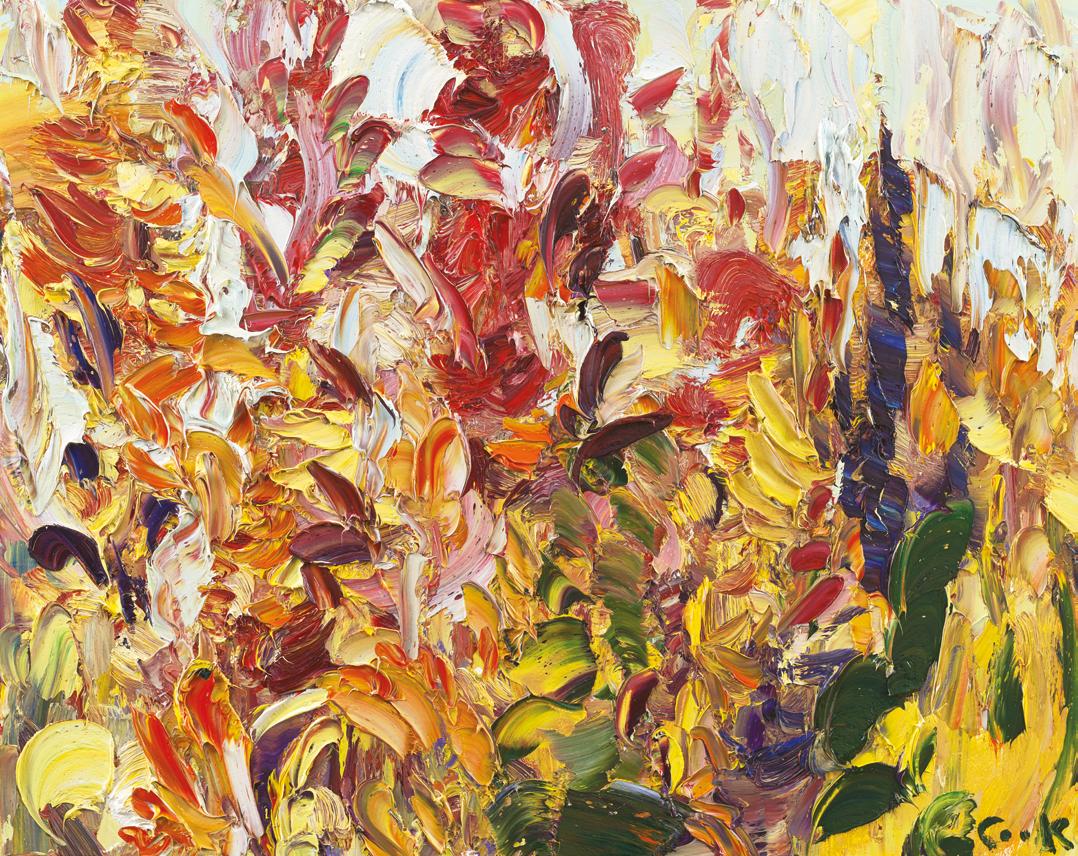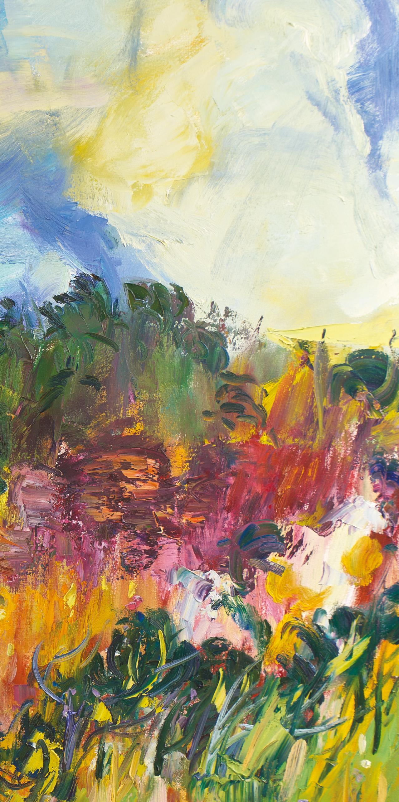The paintings in this exhibition chart the turning of the year, with particular intensity in spring and autumn, when colour reaches its most heightened pitch. In spring, the shock of new greens and blossoms arrives against the winter’s restraint; in autumn, ochres, crimsons and deep umbers flare before retreat. Cook’s handling of oil paint, laid on in rich impasto, mirrors this vitality. The surface of each canvas carries the energy of its making, paint worked and reworked until it holds the sensation of wind through stems or the golden arc of a sinking sun.