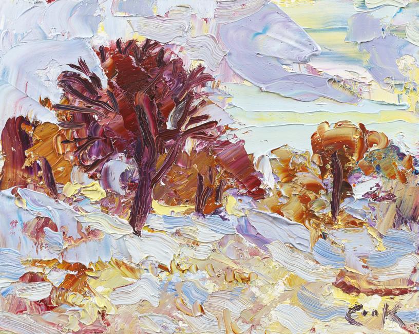 that landscape can carry emotional and spiritual weight. Van Gogh’s ability to invest fields, trees and sown earth with urgency and humanity finds an echo in Cook’s own approach. The Sower’s arc echoes in Cook’s own repeated return to his motif, walking the same ground, observing the same view, yet always seeking something newly revealed. The search is not for novelty, but for truth: how to hold in paint the transient effects of light and season.