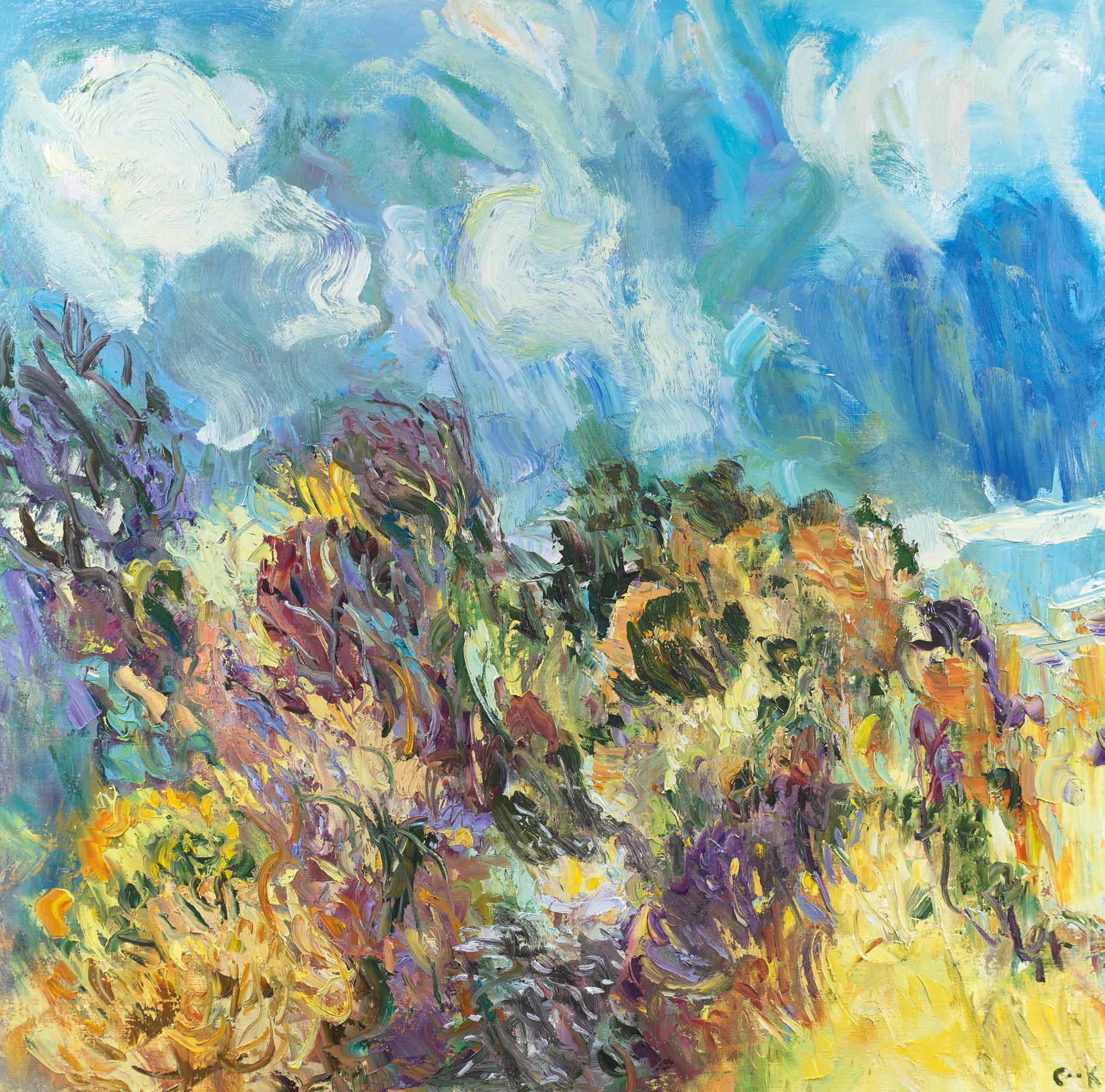 In the 1990s he was already visiting Seagreens (his current home) and staying at a cottage at Benholm, two miles to the North also frequented by Alberto Morocco and Ian Eadie. Cook travelled regularly in these years to Turkey, the Balearics and significantly, at the invitation of the Everard Reed Gallery, to Southern Africa for three months in 1997. He was able to secure the tenancy at Seagreens shortly after his return and eventually bought it in 2004. This sense of belonging is now deeply embedded; he can see the seasons change and paint the whole calendar; the daffodils of Spring, wild flowers of Summer, the Autumn skies and bleak drama of Winter are all on show: immediate, raw and compelling.