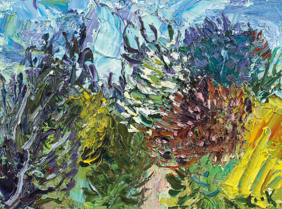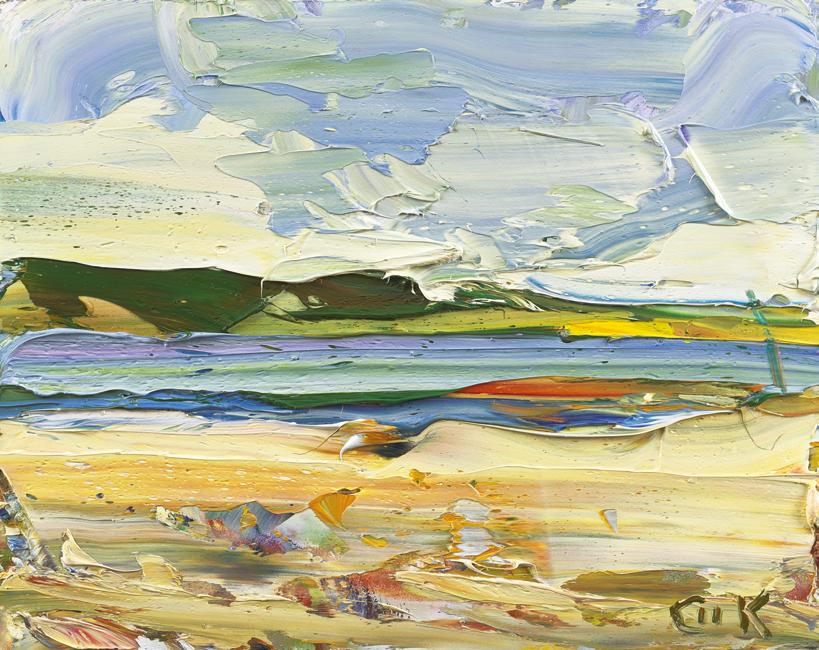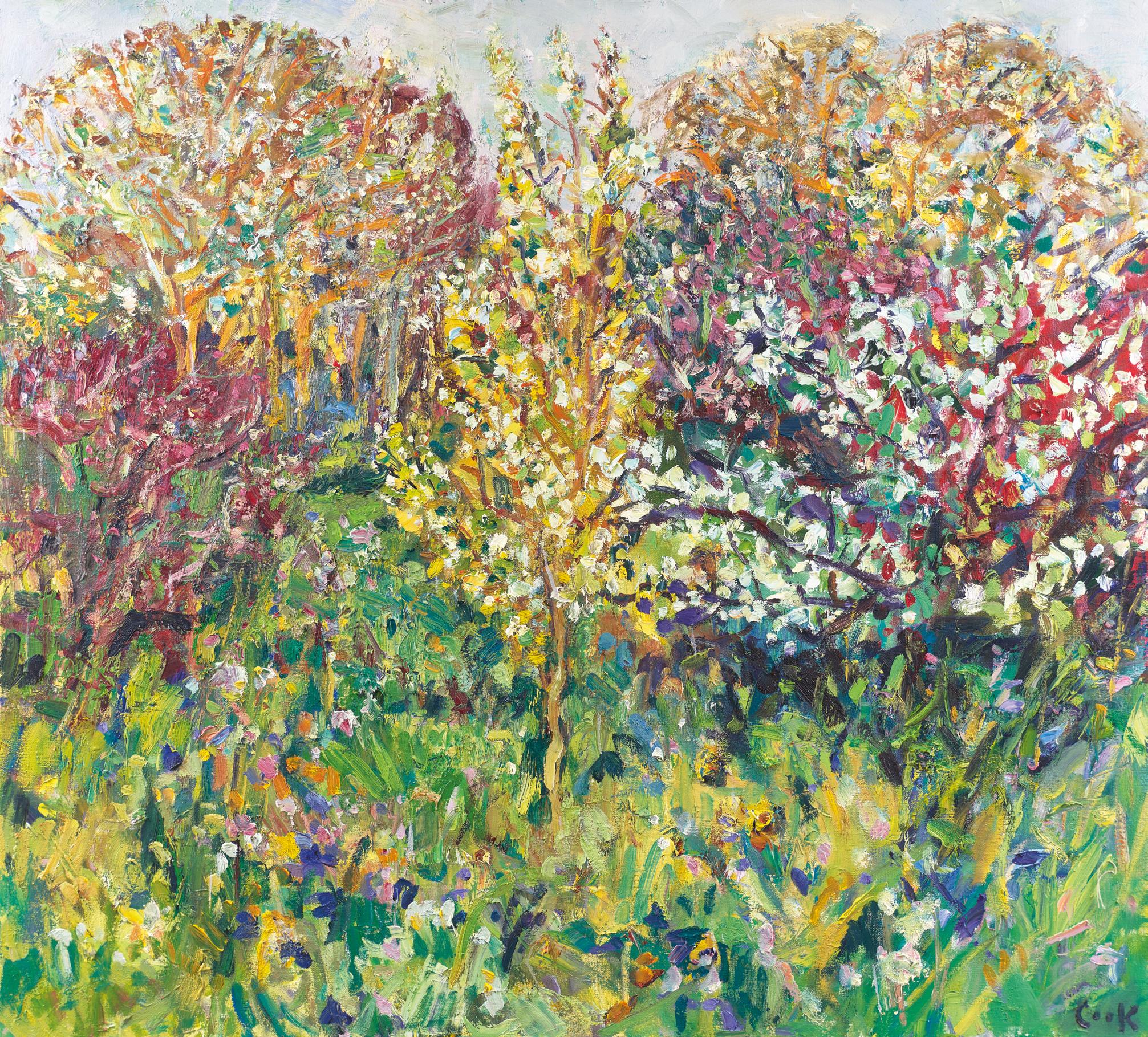 The big landscape of the bay started with apple blossom in the garden, then moved out to the hedges and trees beyond. I never plan exactly what I’m doing, although I work things through in my head. Once a painting begins, it takes hold of me and leads me somewhere. It’s difficult to resist that direction, and most of the time I don’t. If I want to be completely free, I have to let it go its own way. That’s when the paint flows naturally. If I try too hard to control it, it doesn’t work. David Cook