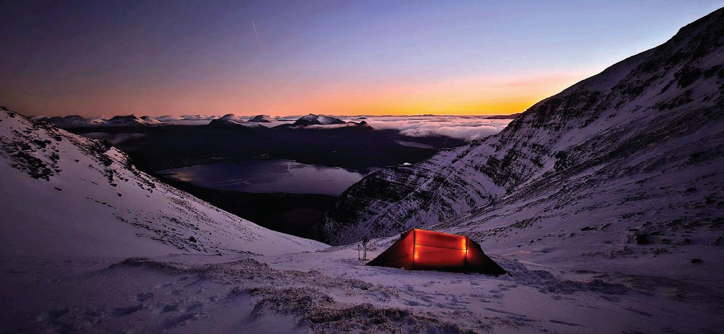 I was feeling dizzy and unable to continue walking, so with sunset approaching I made an emergency camp. My plan was to try to make it through the night and descend the next day. Feeling very weak I tried to set up my tent but the slope I was on, was too steep so it was very precariously pitched. I couldn’t lie on my mat because it was sliding into the tent wall and threatening to destabilise my tent so I made a kind of hole in the snow in the middle of the tent but after 45 minutes I started to get shivery and very cold.