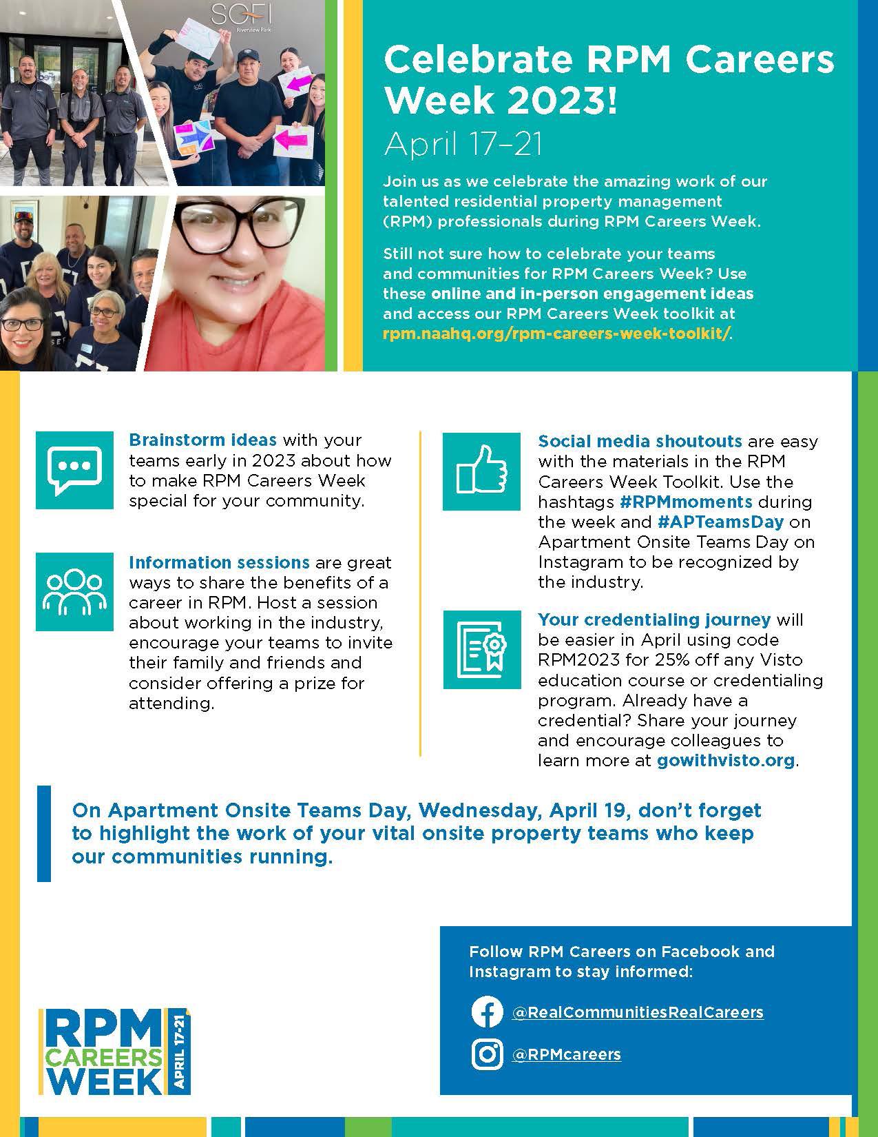 This year, RPM Careers Week is coming early, April 17-21! Celebrate the outstanding work of the residential property management industry and raise awareness about our industry among job seekers. Join us as we encourage team building, recognize individuals for their hard work and provide chances to win exciting prizes. Let’s get started by: