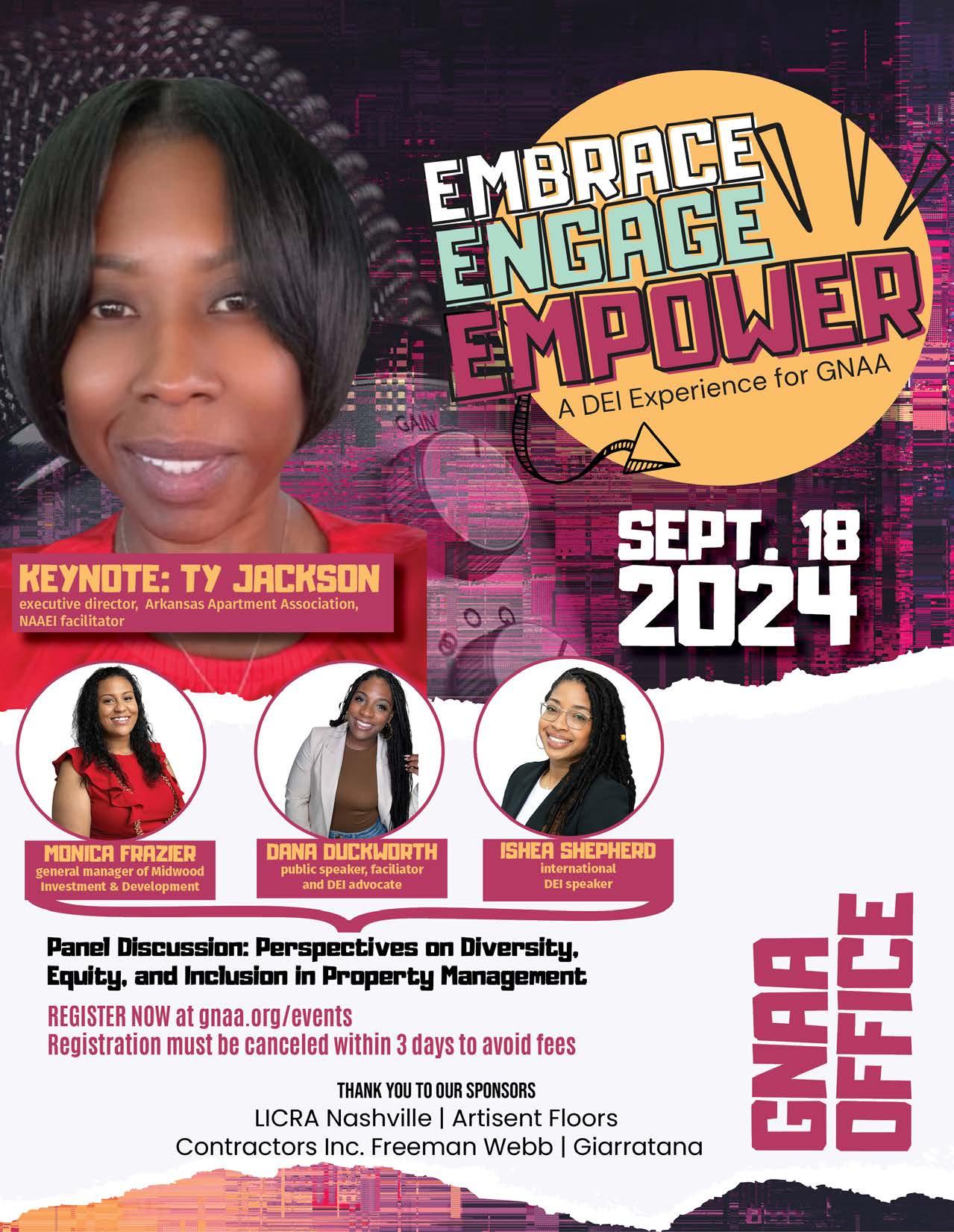 The multifamily industry is evolving, and so is the conversation around Diversity, Equity, and Inclusion (DEI). At the heart of this transformation is the Greater Nashville Apartment Association (GNAA), which is hosting an empowering DEI event titled Embrace, Engage, Empower: A DEI Experience. This event, sponsored by LICRA, Artisent Floors, Contractors Inc., Giarratana Management, and Freeman Webb Company, will be a day of learning, dialogue, and action as the industry gathers to champion inclusivity. Set for September 18 from 2 p.m. - 5 p.m. , the event promises to inspire and equip industry leaders and professionals with the tools to make DEI a priority in their work.