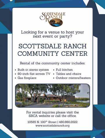 The Scottsdale Ranch Community Association and the active participation of Ranch residents design the lifestyle, integrity, and aesthetics of our community. Visit our website at www. scottsdaleranch.org for more information about our fabulous community!