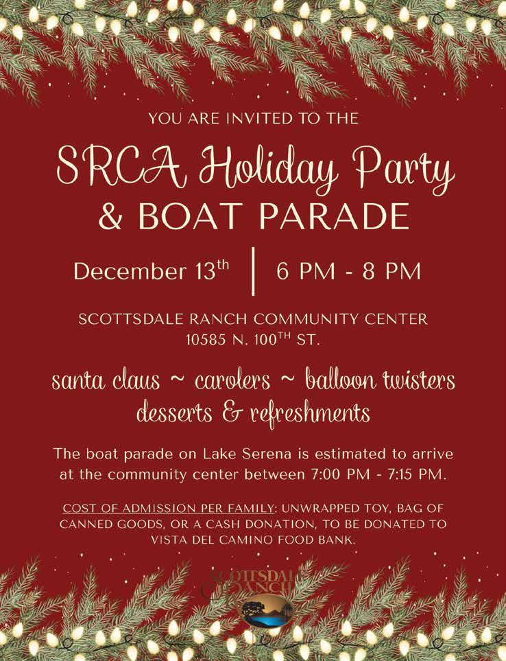 • Our residents have access to our signature private lake, beautiful Lake Serena, for boating and fishing. We also have a well-equipped Community Center which is used for SRCA events. It can also be rented for private events such as weddings, parties, and meetings. Don’t forget all property owners in Scottsdale Ranch are entitled to a free boat ride every two years.
