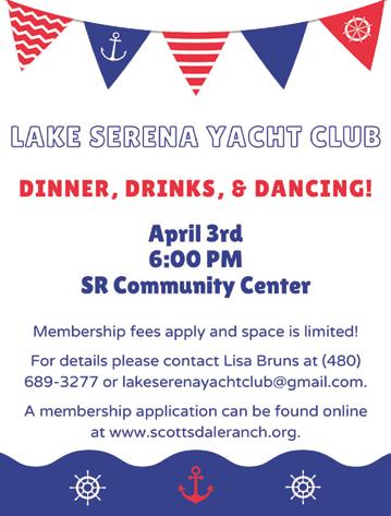 info@clcpublicationsllc.com. Social Life on the Ranch 17 SRCA Fishing Derby SRCA Lake Festival! 18 New Resident Welcome Party Wrap Up SRCA Community Group Spotlight 19 Lake Serena Activities 20 Blood Drive Thank You 21 SRCA Block Party Trailer 22 Jazz Night Get Involved! Yacht Club Corks & Forks 23 Knitwits Crochet Group Scottsdale Ranch Women’s Association Retired Active Men’s Coffee Wine Experience 24 Scottsdale Ranch Golf Club Pasta and Pasta Sauce Donation Drive Do You Like to Play Chess? Scottsdale Ranch Community Center 25 Cinco De Mayo Happy Hour! In Every Issue IFC Scottsdale Ranch Real Estate Update By Peggy Rauch 28 SRCA Calendar of Events In the Community 26 Scottsdale Police Safety Tips Movie in the Park Sponsor Thank You CLC Publications LLC For advertising call 480-702-0458 or visit www.clcpublicationsllc.com
