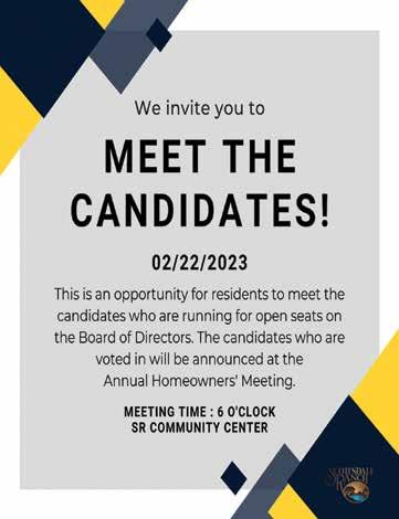 The Board of Directors meets the fourth Tuesday of every month at the Community Center. These meetings are open to the membership. Meeting minutes can be found on our website at www. scottsdaleranch.org under SRCA Documents and Forms, Board of Directors..