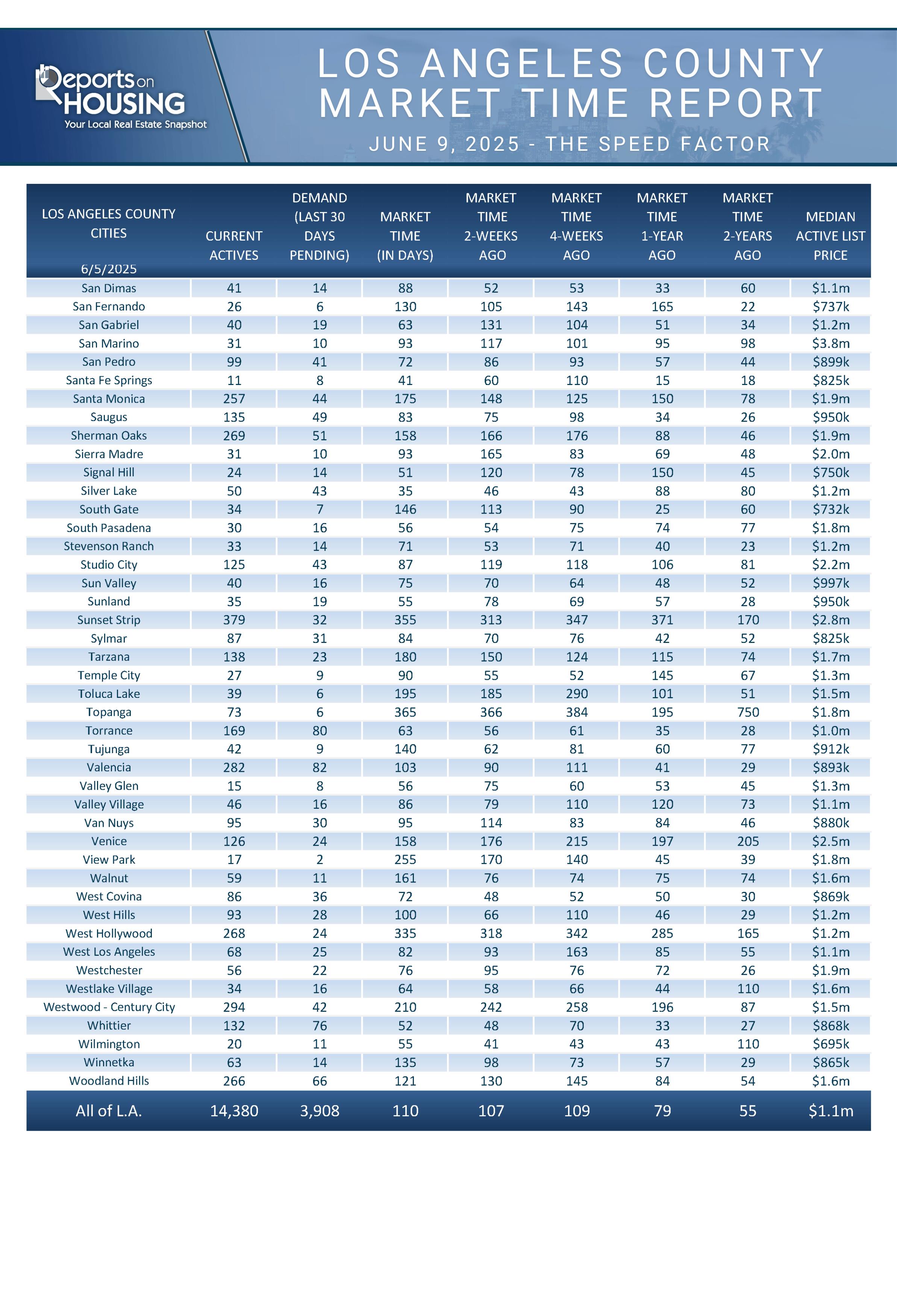 Similarly, when the Los Angeles County housing market is divided into various price ranges and separated between single-family detached homes and attached condominiums and townhomes, there is a variety of different speeds. Some ranges take weeks, while others take months or close to a year.