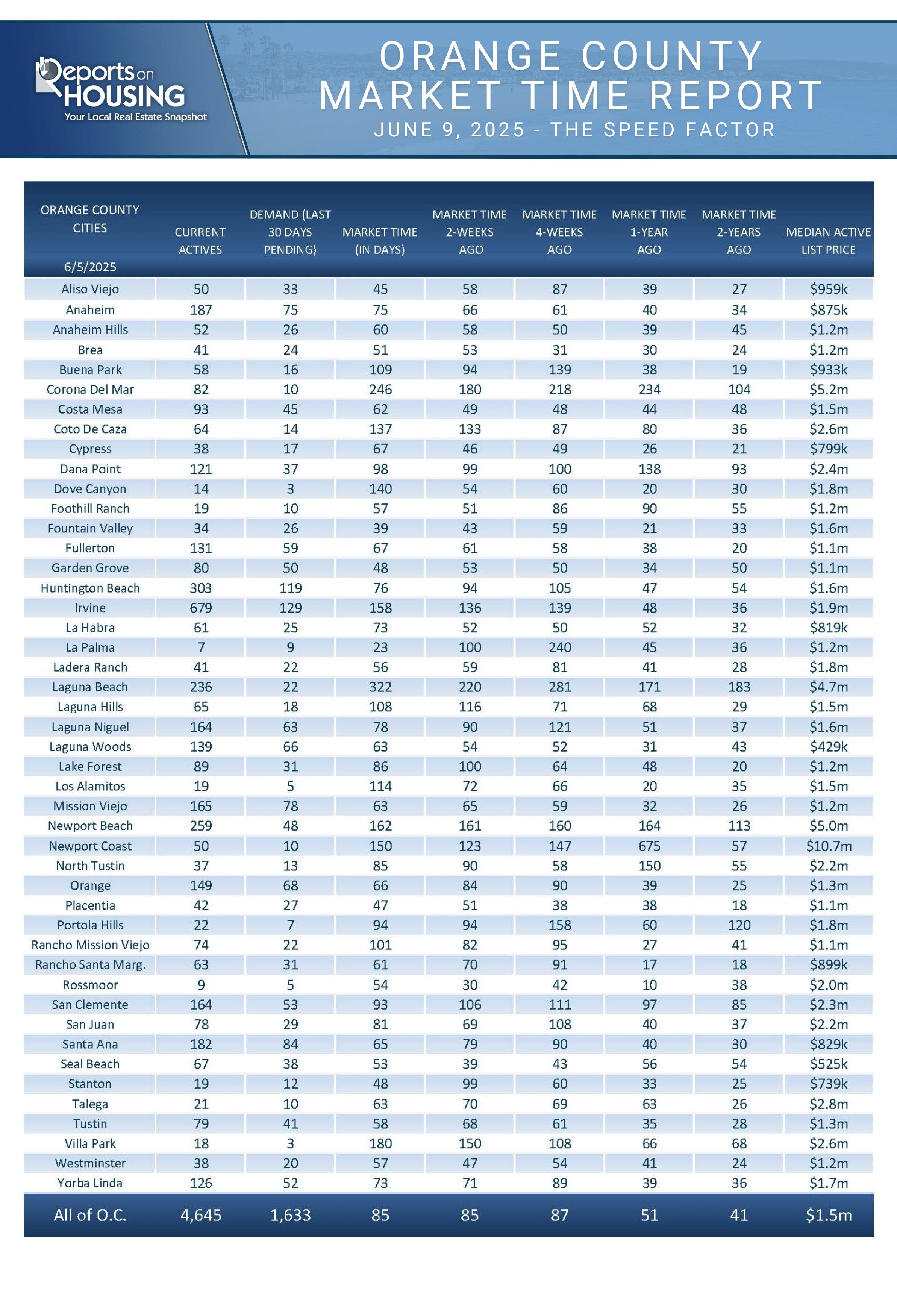 With the supply of available homes rising by 50 homes, up 1%, and demand increasing by 12 pending sales, also up 1%, the Expected Market Time (the number of days it takes to sell all Orange County listings at the current buying pace) remained unchanged at 85 days in the past couple of weeks.