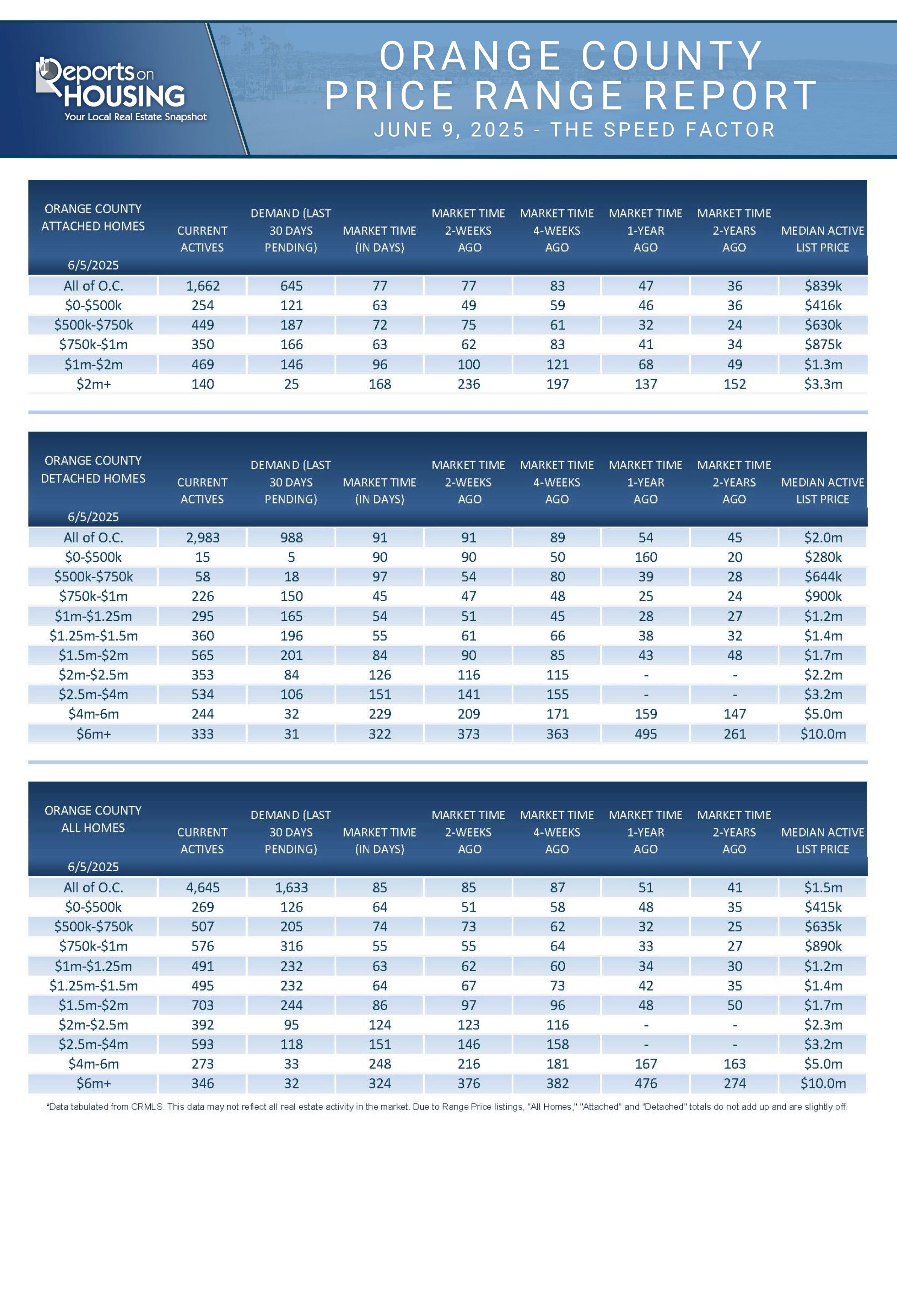 Similarly, when the Orange County housing market is divided into various price ranges and separated between singlefamily detached homes and attached condominiums and townhomes, there is a variety of different speeds. Some ranges take weeks, while others take months or close to a year.