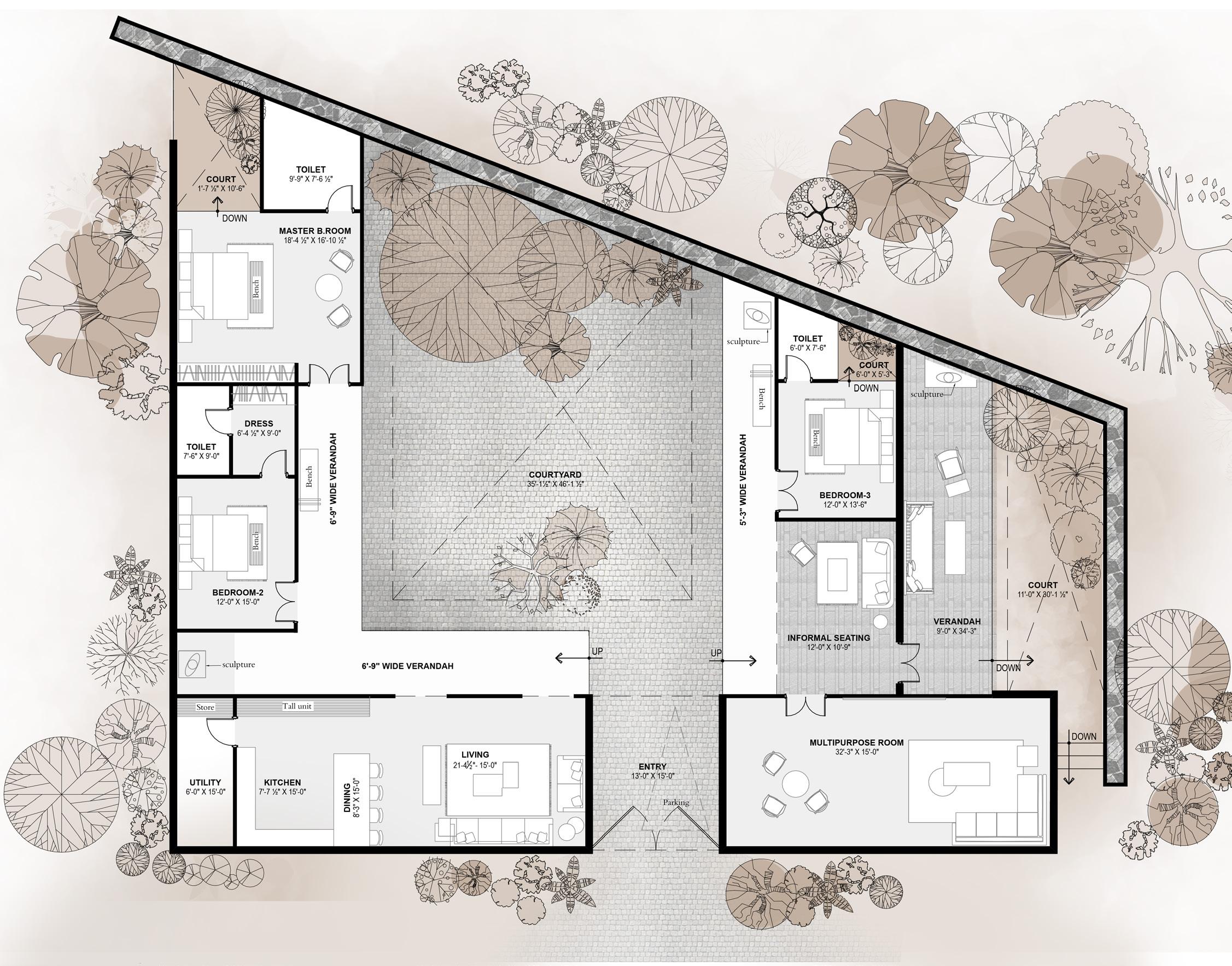 The home let’s the user experience changing nature of daylight and keeps the circadian rhythm intact through a series of spaces that change in volumes and scale .The play of spaces and the visual connect from court- court , in between habitable spaces to courts and in between floors keeps the users attuned with each others activities.